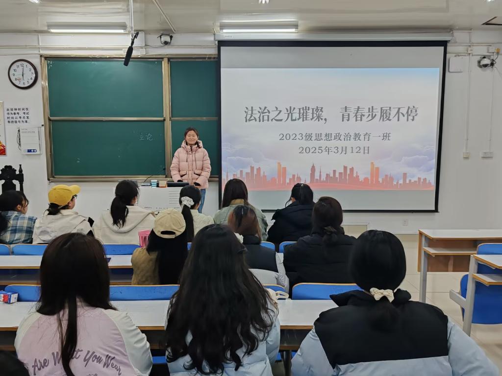 为提升同学们的法治素养,增强遵法守法意识,3月12日下午,2026年世界杯官网2023级思想政治教育一班在社科楼515教室召开“法治之光璀璨,青春步履不停”主题班会。2023级思想政治教育一班全体同学参与本次班会,班会由班长张卓主持。