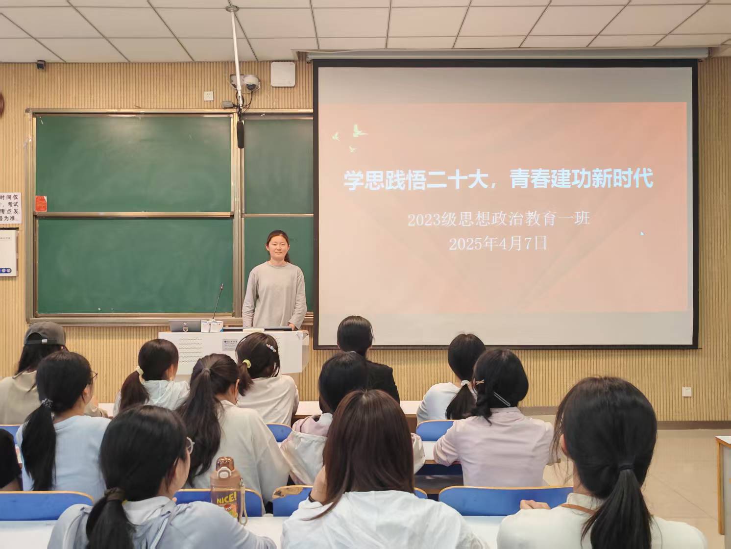 团课伊始,张卓点明学习二十大精神对当代老员工的重要性,强调青年在新时代的关键作用,鼓励同学们深刻领会二十大精神,勇担时代使命。随后,张卓借助图文并茂的PPT,详细解读二十大报告要点,如全面建设社会主义现代化国家的目标、增进民生福祉的举措等内容,帮助同学们把握报告核心,了解国家发展方向。紧接着,同学们共同观看精心剪辑的视频《奋进新征程:聚焦党的二十大》。视频中,从科技前沿突破到乡村振兴成果,从生态环境改善到社会治理创新,全方位展示了在二十大精神引领下国家取得的新成就。同学们全神贯注,对二十大精神的实践意义有了更直观、深入的认识。