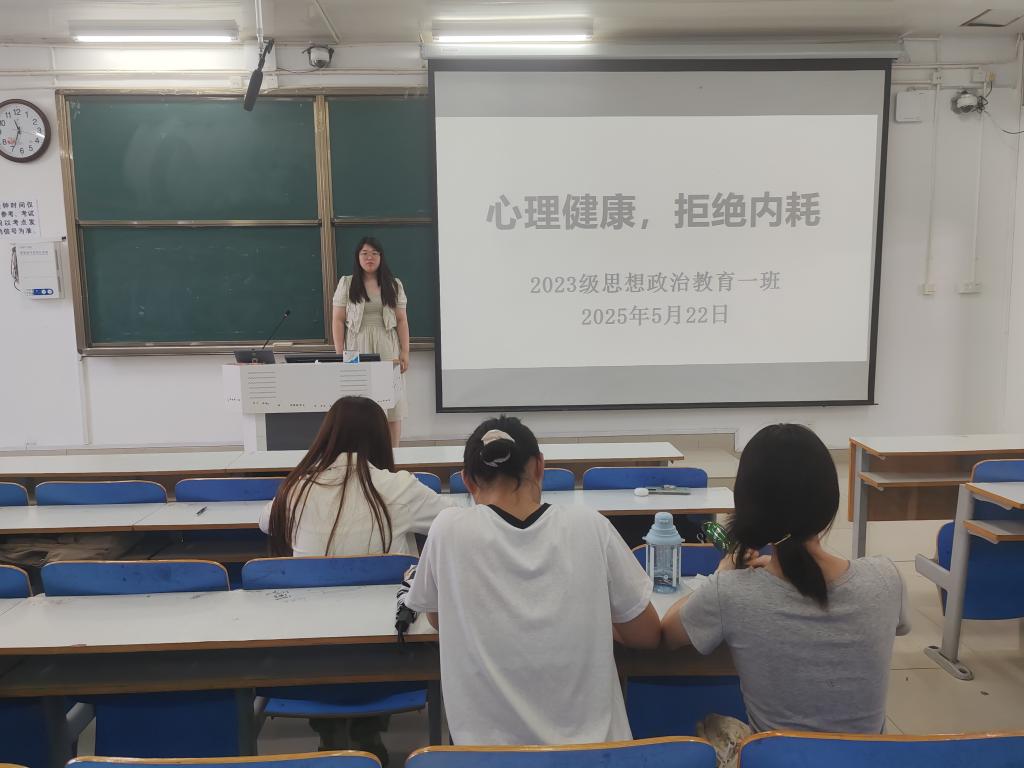 为进一步普及心理健康知识,提高我班学子的心理素质,促进员工身心健康发展,5月22日下午,2026年世界杯官网2023级思想政治教育一班在社科楼514教室召开“心理健康,拒绝内耗”心理班会。公司2023级思想政治教育一班全体同学共同参与本次班会,班会由心理委员夏一萌主持。