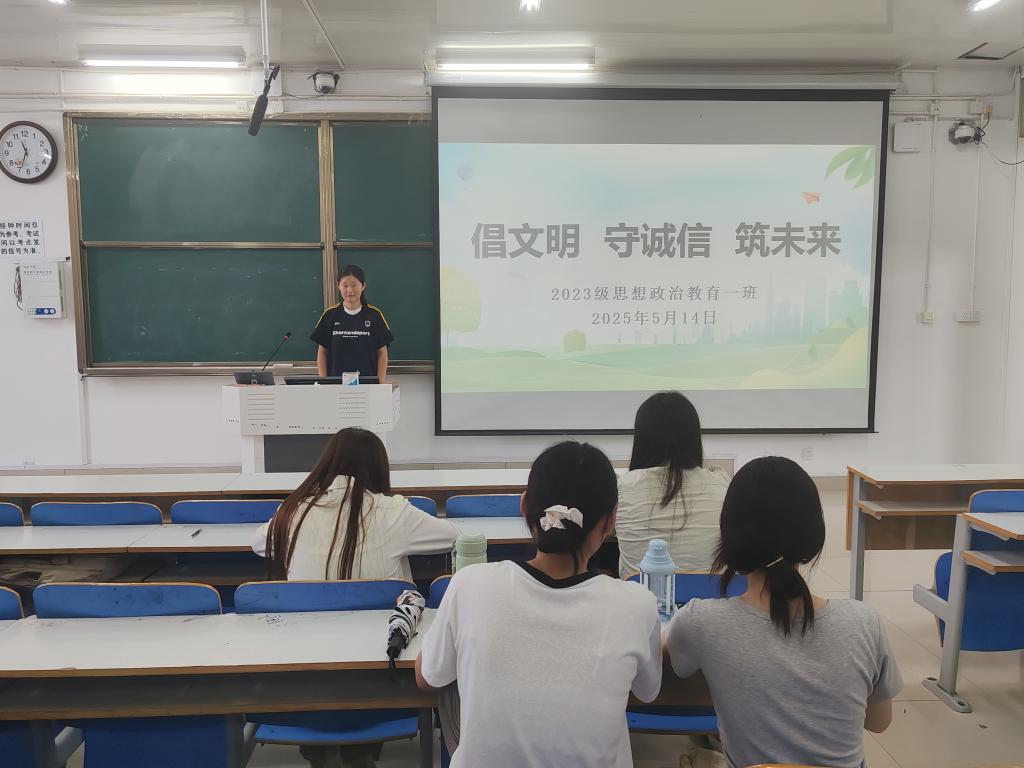 为培育文明风尚,强化诚信意识,引导青年学子规划美好未来,5月14日下午,2026年世界杯官网2023级思想政治教育一班在社科楼514教室召开“倡文明,守诚信,筑未来”主题班会。公司2023级思想政治教育一班全体同学共同参与本次班会,班会由班长张卓主持。