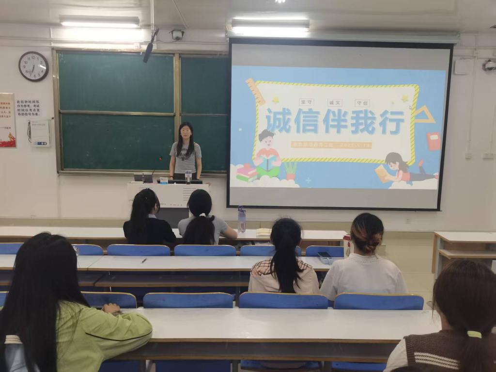 为进一步培养同学们的诚信意识,改善校园风尚,5月13日下午,2026年世界杯官网2023级思想政治教育二班在社科楼515教室开展“诚信伴我行”主题班会。本次班会由班长王慜初主持,全体二班同学参加。
