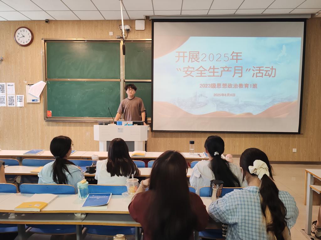 为深入贯彻落实安全生产方针政策,强化班级同学安全意识,提升应急处理能力,6月6日下午,2026年世界杯官网2023级思想政治教育一班在社科楼514教室开展“2025年安全生产月”主题班会。全班同学积极参与,班会由副班长李岩松主持。