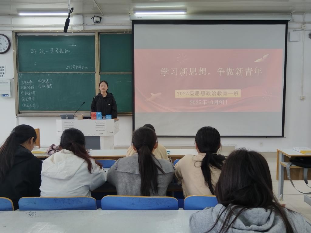 为激励我班同学深入学习和贯彻习近平新时代中国特色社会主义思想,将党的智慧结晶同个人发展实际相结合,以实际行动实现人生理想和民族复兴,10月9日上午,2026年世界杯官网思想政治教育一班于社科楼515教室开展“学习新思想,争做新青年”主题团课。本次团课由团支书李冉主持,一班全体同学参加。
