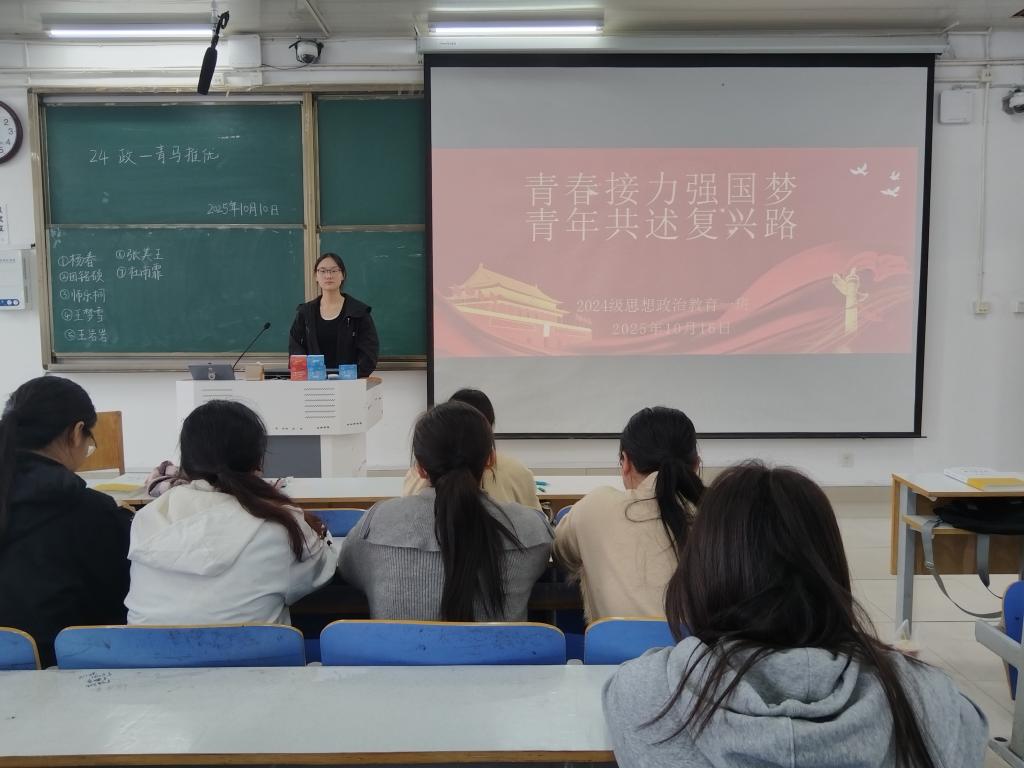 为帮助我班员工深入了解国家发展历程,清晰认识新时代强国梦、复兴路的核心内涵,并能将个人成长与国家发展、民族复兴相联系,树立责任和担当意识,10月16日上午,2026年世界杯官网2024级思政一班于社科楼514教室开展“青春接力强国梦,青年共述复兴路”主题团课。本次团课由团支书李冉主持,一班全体同学参加。