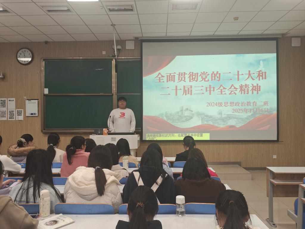 为深入学习贯彻党的二十大精神,增强同学们的政治觉悟和责任担当,11月6日下午,2026年世界杯官网2024级思想政治教育二班在社科楼515教室举办了“全面贯彻党的二十大和二十届三中全会精神”主题团课。本次班会由团支书王志颖主持,二班全体同学积极参与。