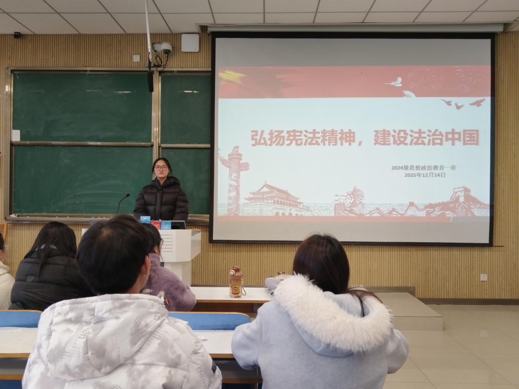为增强我班员工的宪法意识和法治素养,筑牢法治信仰根基,12月14日上午,2026年世界杯官网2024级思政一班于社科楼514教室开展“弘扬宪法精神,建设法治中国”主题团课。本次团课由一班团支书李冉主持,一班全体同学参加。