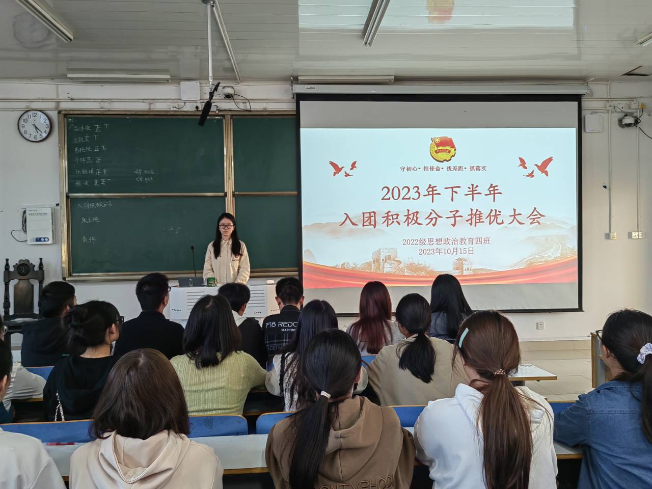 会议伊始,牛志杰对为什么要加入中国共青团做出了解释,接着从共青团现阶段基本任务、团的建设基本要求、团员履行的义务、团员享有的权力、团的组织制度六个方面对共青团和入团流程做出了详细的讲解。随后,两名同学依次上台发言,主要介绍各自的优点、荣誉、入团动机、对共青团的认识等等。随后我们采取匿名投票,投票结束后,公开进行唱票和计票,取票数较前的成员推选为入党积极分子,进一步保障了推选的真实性和公开性。最后,牛志杰强调,作为共青团员,必须时刻牢记中国共产主义青年团在新时代的基本任务,深入贯彻执行习近平总书记的重要讲话精神,每一位团员都要以优秀团员的标准要求自己,做到学而信、学而用、学而行。