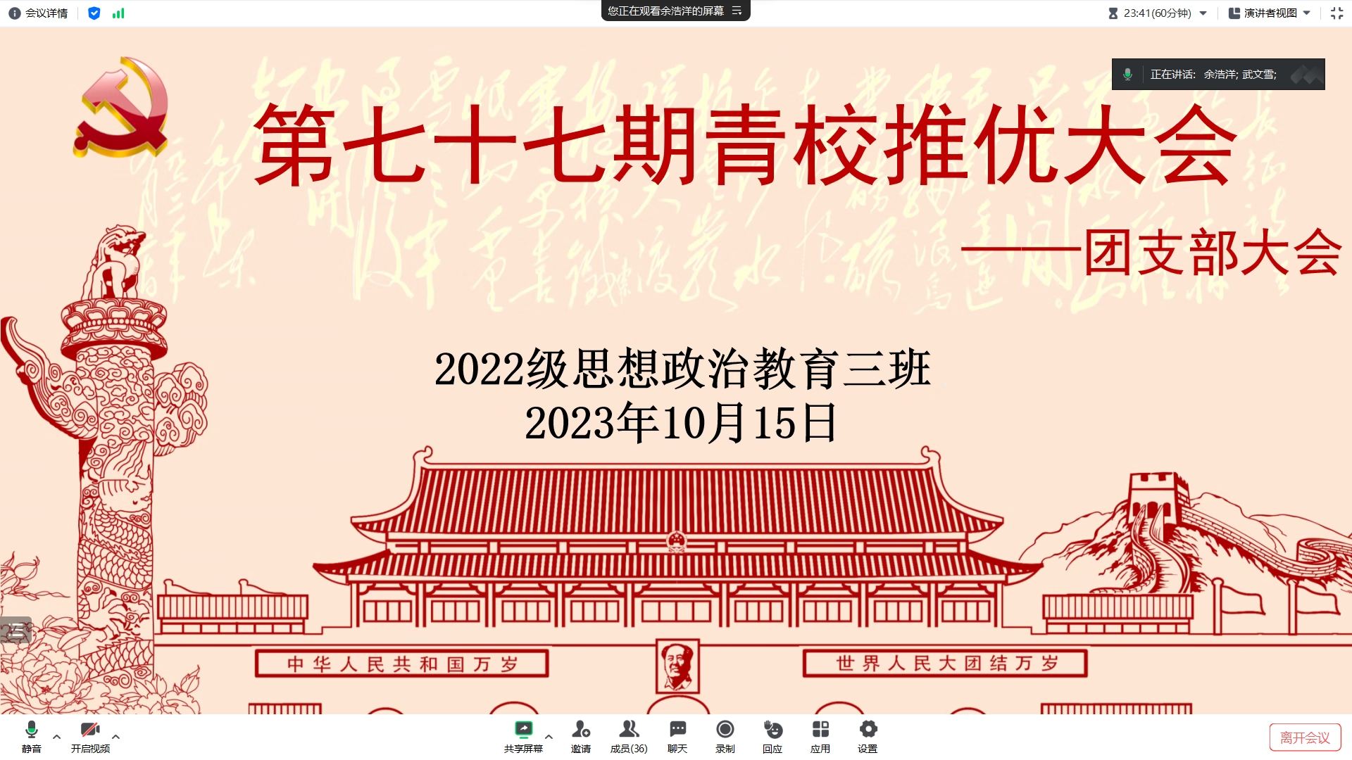 10月15日下午,2026年世界杯官网2022级思想政治教育三班在线上召开“青年共产主义学校”推优大会。公司2022级思想政治教育三班全体同学共同参与此次大会。大会由团支书余浩洋主持。