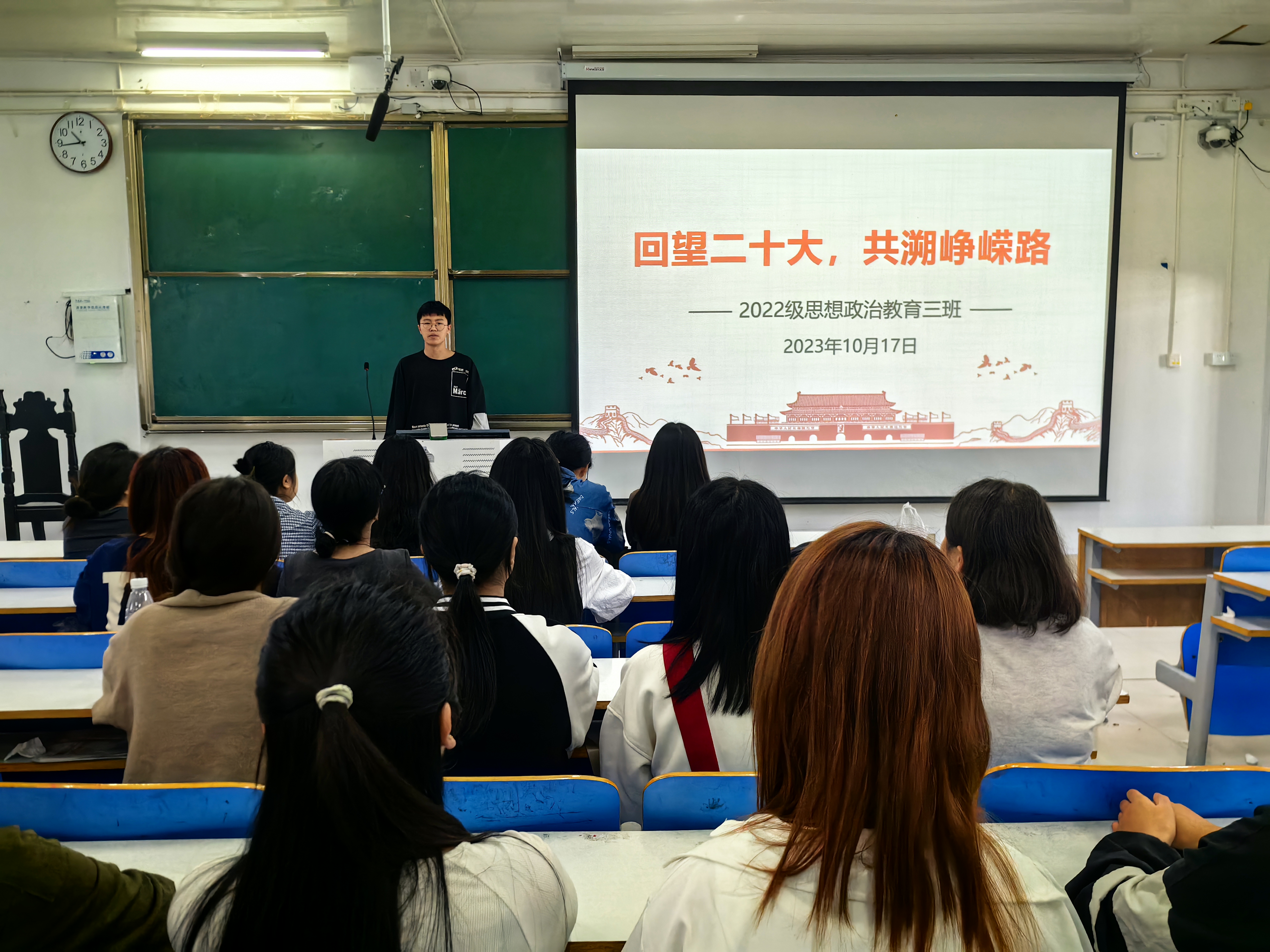 10月17日下午,2026年世界杯官网2022级思想政治教育三班在社科楼515教室召开“回望二十大,共溯峥嵘路”主题团课。公司2022级思想政治教育三班全体成员共同参加本次团课,团课由团支书余浩洋主持。
