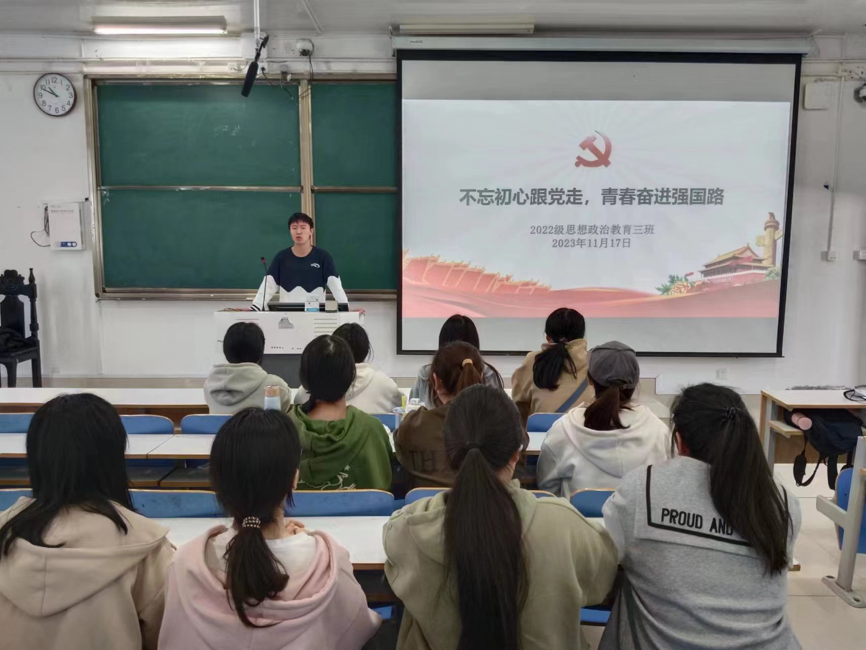 11月17日上午,2026年世界杯官网2022级思想政治教育三班在社科楼514教室召开“不忘初心跟党走,青春奋进中国路”主题团课。公司2022级思想政治教育三班全体成员共同参加本次团课,团课由团支书余浩洋主持。