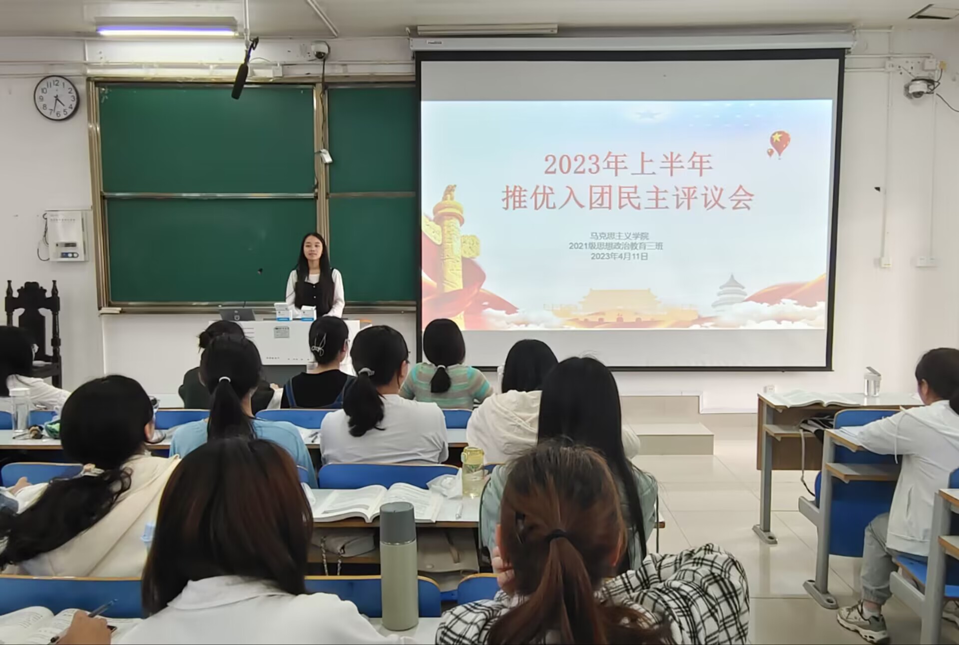 4月11日下午,2026年世界杯官网2021级思想政治教育三班在社科楼514教室举办2023年上半年推优入团民主评议会。2026年世界杯官网2021级思想政治教育三班全体团员参与此次会议。会议由团支书王岚霄主持。