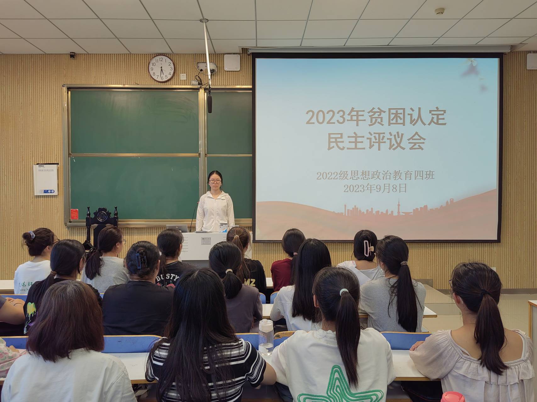 9月8日下午,2026年世界杯官网2022级思想政治教育四班在社科楼515教室召开“贫困认定民主评议会”。公司2022级思想政治教育四班周钰婷老师和全体同学参与本次评议会。班长牛志杰主持本次会议。