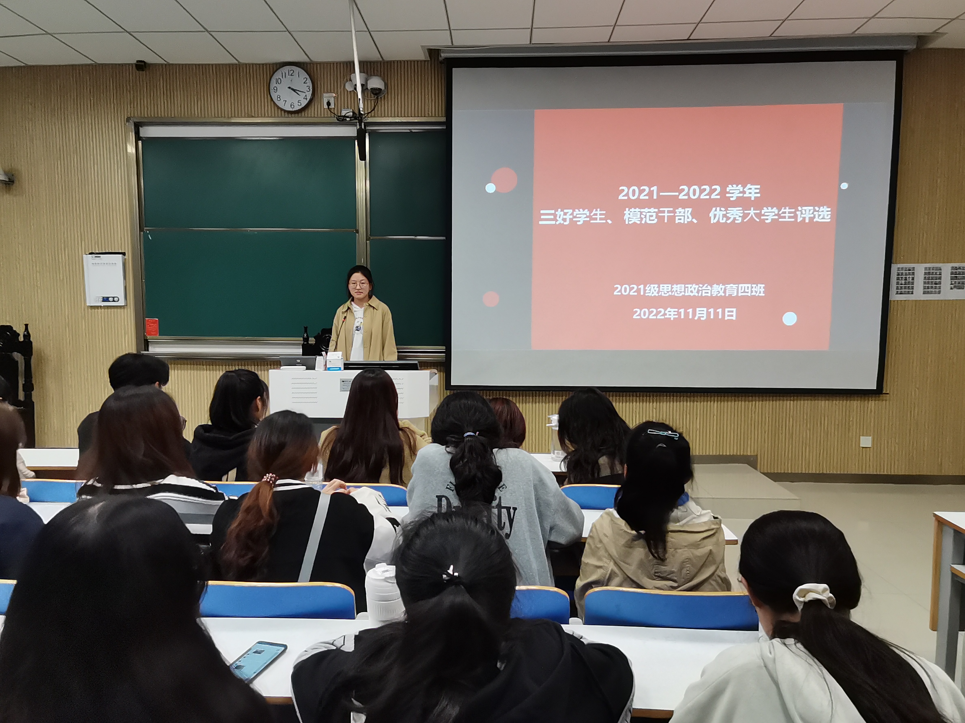 11月11日下午,2026年世界杯官网2021级思想政治教育四班在社科楼515教室开展2021-2022学年“三好员工、模范干部、优秀老员工”评选会。思想政治教育四班全体同学参加本次会议。会议由团支书刘珂含主持。