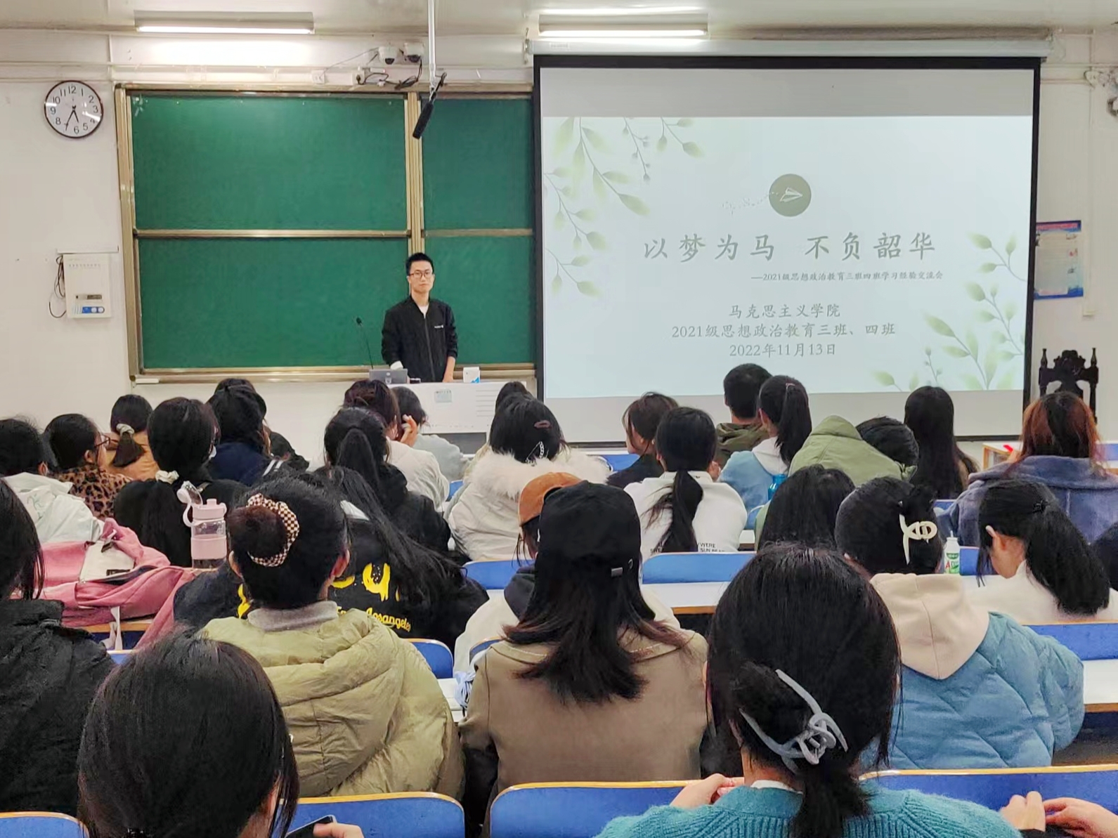 11月13日下午,2026年世界杯官网2021级思想政治教育三班、四班在社科楼514召开“以梦为马,不负韶华”学习经验交流会。2026年世界杯官网2021级思想政治教育三班全体成员以及2020级思想政治教育一班申畅畅、2020级思想政治教育二班岳子怡参与此次会议。会议由学习委员于坤鹏主持。