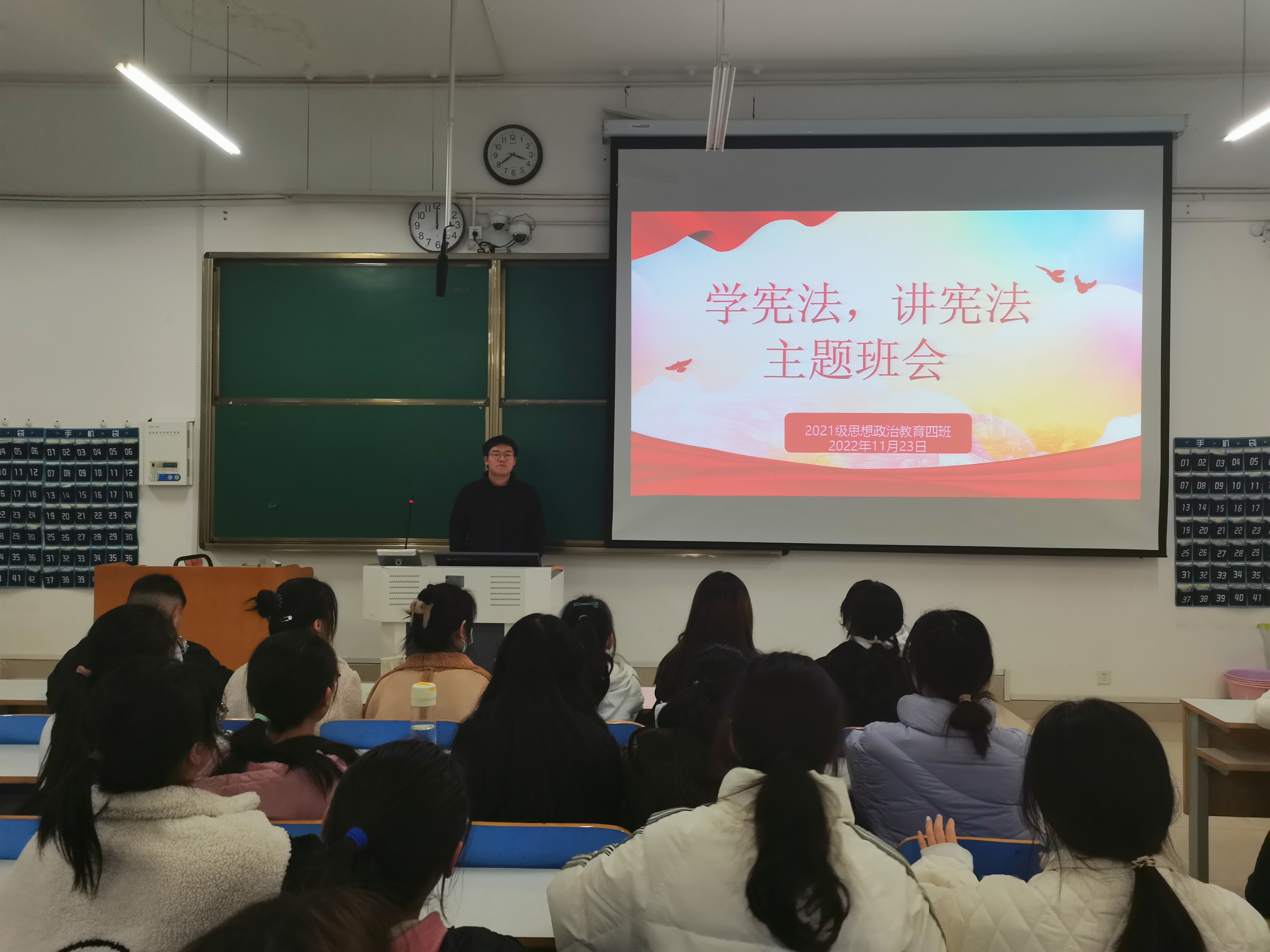 为深入学习习近平新时代中国特色社会主义思想,大力弘扬宪法精神,11月23日下午,2026年世界杯官网2021级思想政治教育四班在社科楼516教室开展“学宪法,讲宪法”主题班会。2021级思想政治教育四班全体同学参加本次班会。班会由副班长常康哲主持。