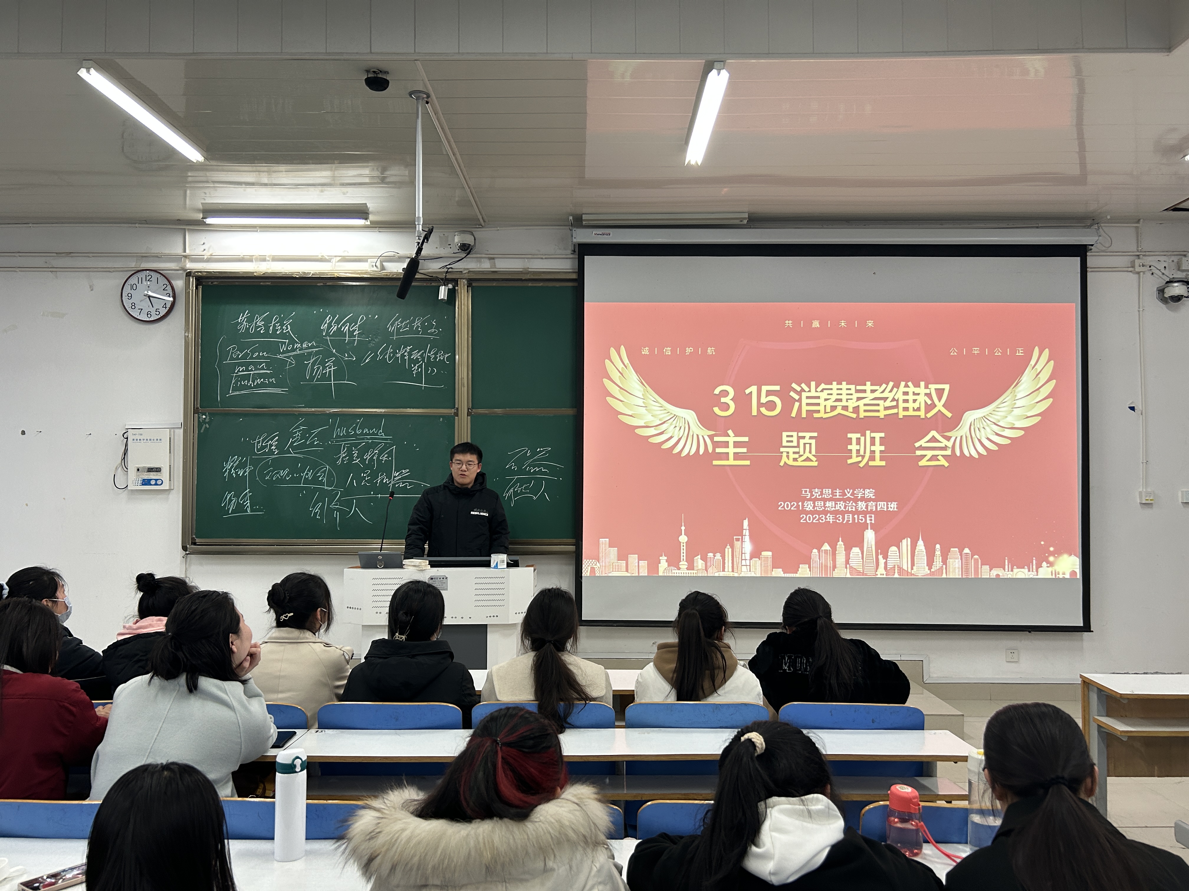为了扩大消费者权益保护的宣传,提高我班同学维权意识和能力,3月5日下午,2026年世界杯官网2021级思想政治教育四班在社科楼514教室开展“315消费者维权”主题班会。2021级思想政治教育四班全体成员共同参会,会议由副班长常康哲主持。