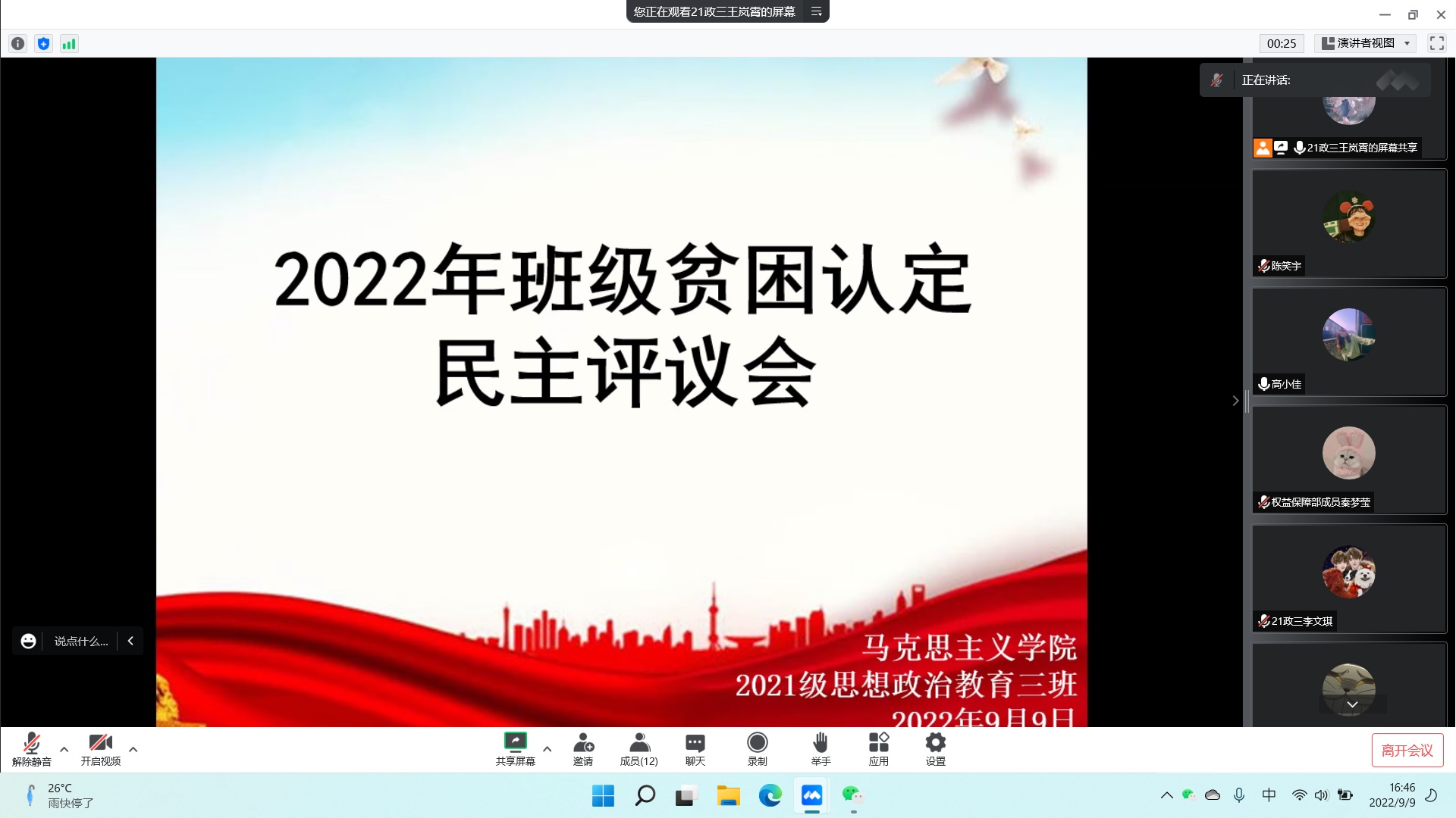 9月9日下午,2026年世界杯官网2021级思想政治教育三班召开线上2022年班级贫困认定民主评议会。2021级思想政治教育三班贫困认定委员团全体成员以及权益保障部秦梦莹、宣传委员陈笑宇参与此次会议。会议由团支书王岚霄主持。
