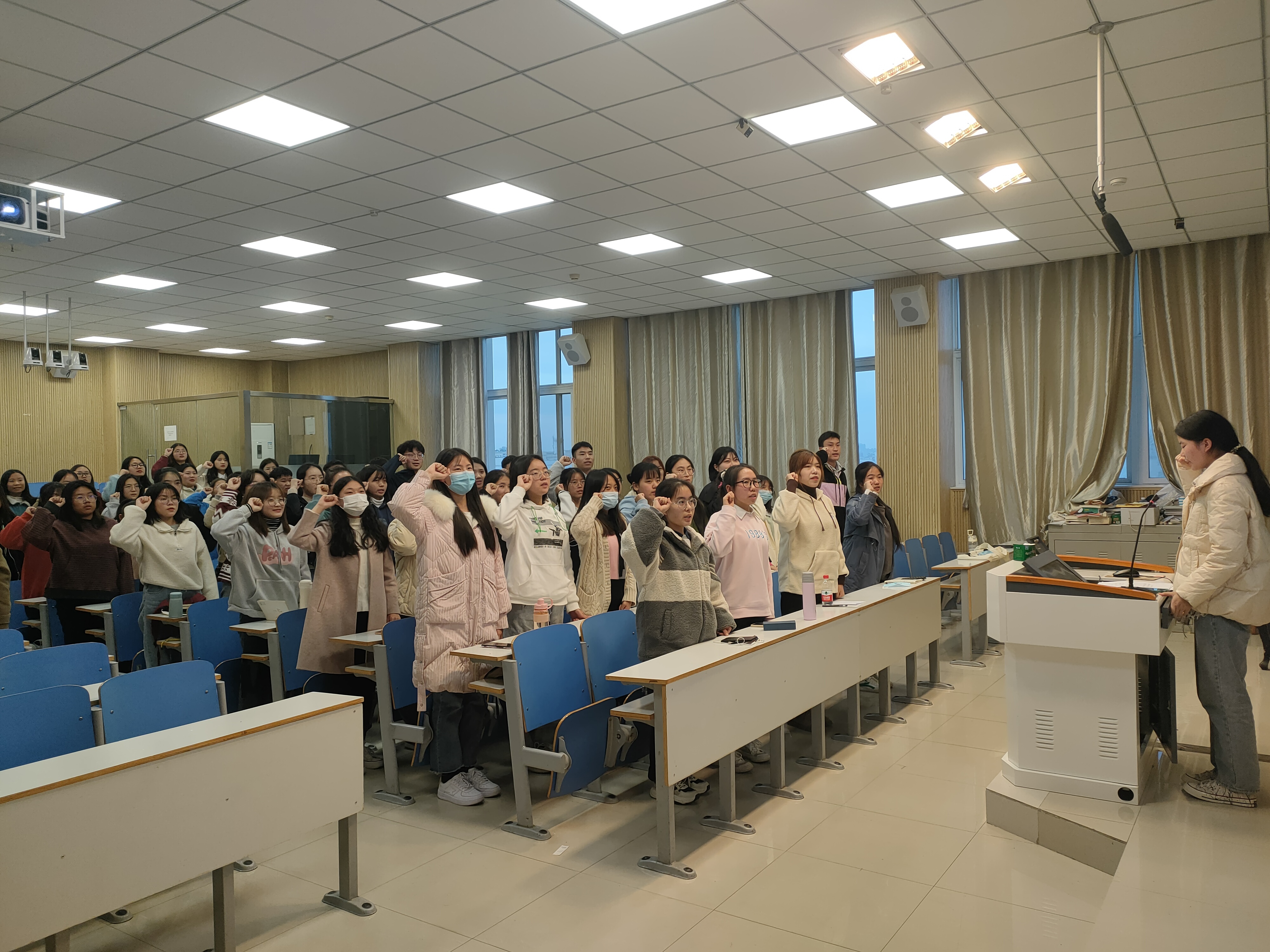 会议伊始,李晨曦宣读了本次会议的主题及会议要求。全体团员起立,共唱团歌。随后,团支书结合实际,详细汇报了本支部一年来各方面的具体情况。团支部委员、团员分别从自身学习收获、不足之处和改进方向三个方面依次上台发言,他们表示,要进一步端正思想,加强党团理论知识学习,努力钻研文化知识和专业知识,将理论知识运用到实际问题当中,提高自身综合素质。在团员先进性民主测评投票环节,团员们认真履行自身义务,积极参与投票。测评投票秉持“公开、公平、公正”的原则,实行现场举手表决,全体团员均全票通过。接着,辅导员陶青青进行点评讲话并作出会议总结。她表示,各团员实事求是、敢于自我批评反思的精神值得表扬,广大团员应深入学习团的基础理论知识,努力提升理论与实践相结合的能力,做到知行合一,成为一名合格的团员。针对当下严峻复杂的疫情形势,她告诫广大团员要增强政治意识和责任意识,履行团员义务,严格遵守学校规章制度,为疫情防控贡献力量。最后,全体团员重温入团誓词,会议圆满结束。