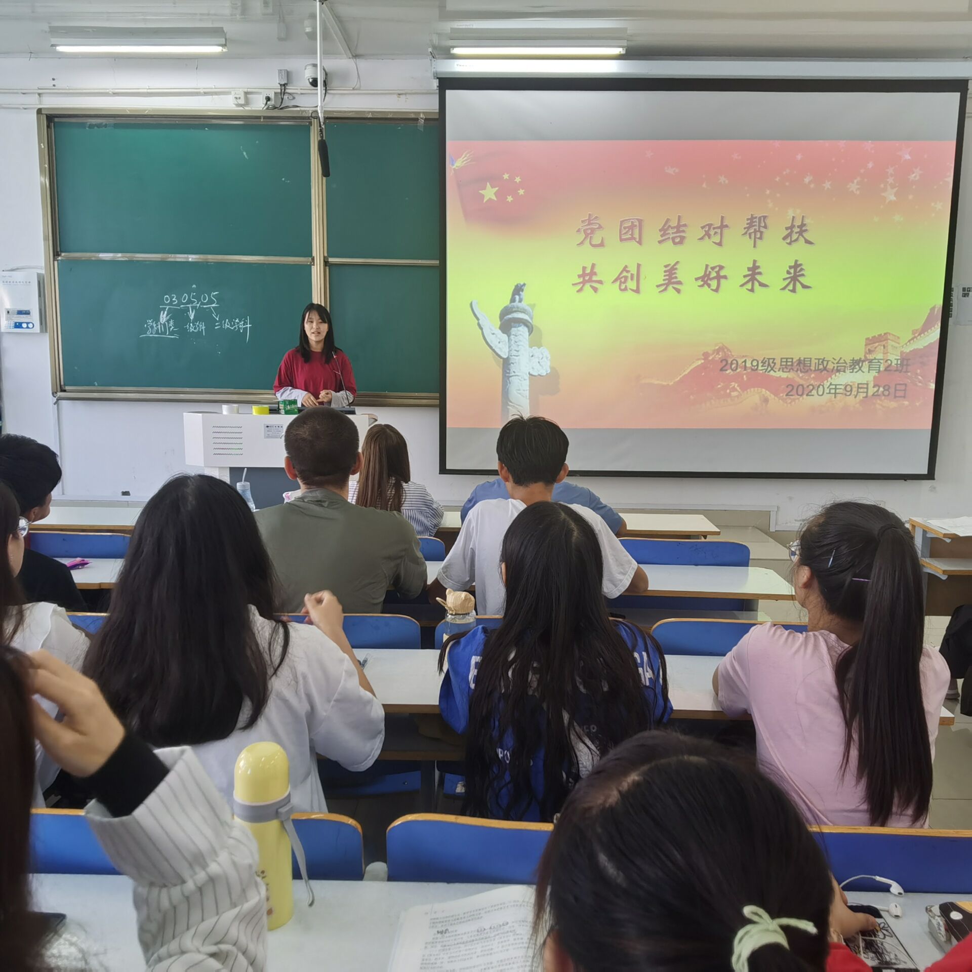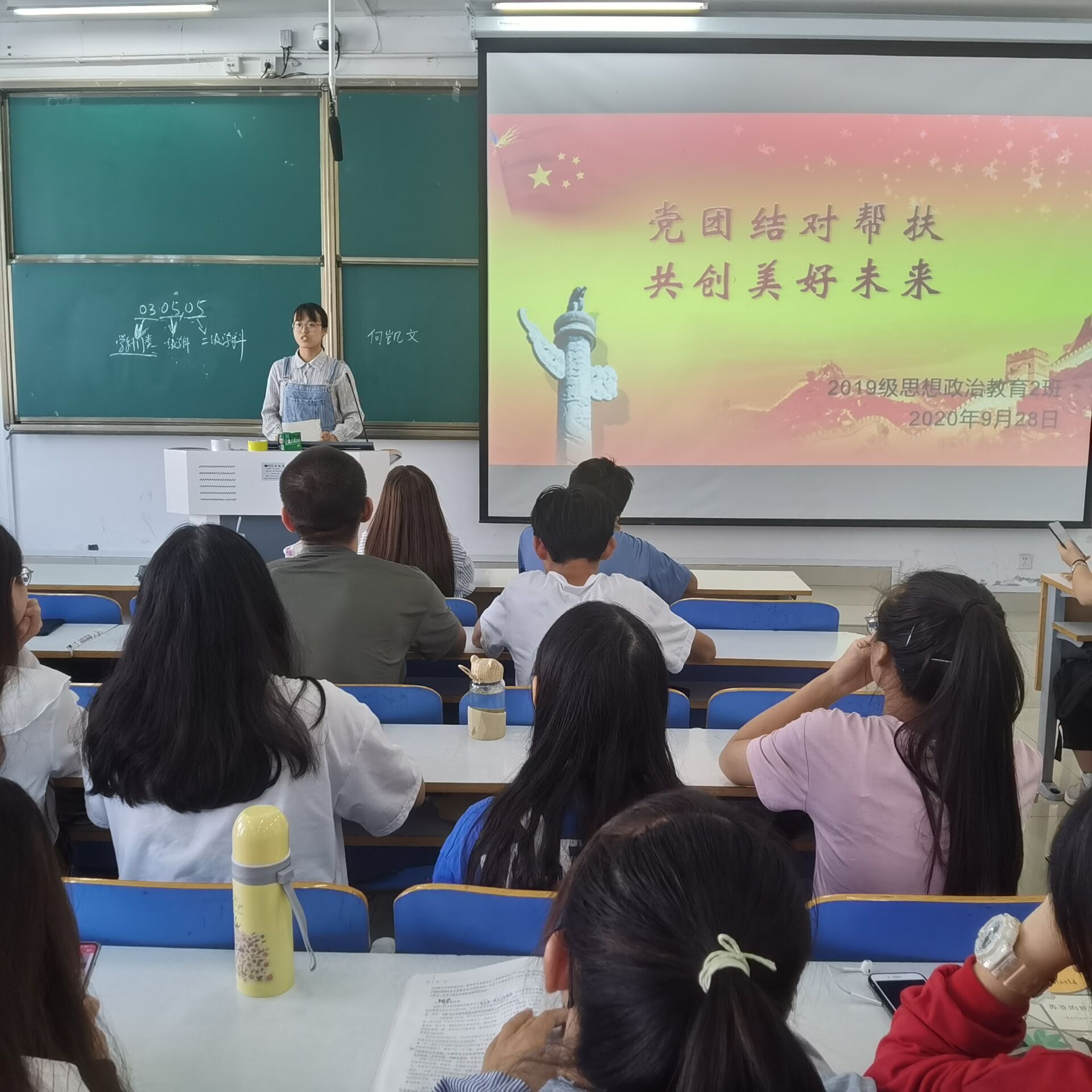 9月28日上午,2026年世界杯官网2019级思想政治教育二班在社科楼516教室召开了“党团结对帮扶,共创美好未来”主题会议。公司预备党员张晓艳、王文芳及2019级思想政治教育二班全体成员共同参会。会议由团支书孙雅娴主持。