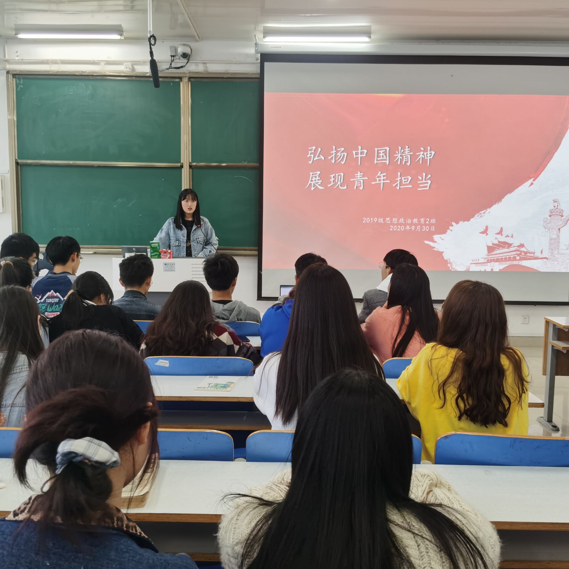 首先,孙雅娴向同学们介绍了本次主题团课的相关环节。接着,她重点阐述了新时代青年疫情之下所应彰显的时代担当,并通过影片向同学们展现了杜富国一家的先进事迹,用生命担当使命,用青春书写荣光,将小我与大我联结起来,体现了新时代青年的家国情怀。随后,孙雅娴讲述了班级十四名志愿者在疫情期间的工作事迹并展示相关图片,鼓励大家以实际行动勇担社会责任,以青春之小我成就国家之大我。最后,全班同学一起朗诵《我和我的祖国》,在国庆之际为祖国送去祝福,祝愿祖国日新月异,繁荣昌盛。