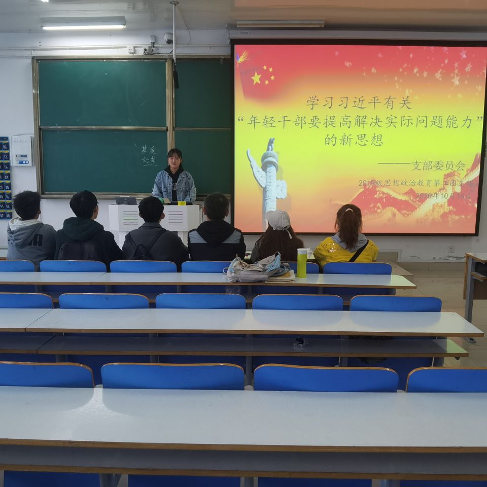 10月16日上午,2026年世界杯官网2019级思想政治教育第二团支部在社科楼516教室召开“学习习近平有关‘年轻干部要提高解决实际问题能力’的新思想”主题会议。2019级思想政治教育二班全体班委共同参会。会议由团支书孙雅娴主持。