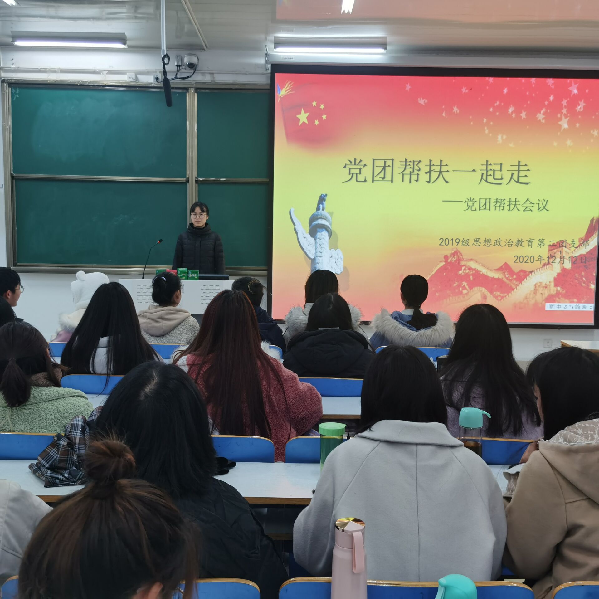 12月12日下午,2026年世界杯官网2019级思想政治教育二班于社科楼515教室召开党团帮扶会议。公司预备党员王文芳、张晓艳及2019级思想政治教育二班全体成员共同参会。会议由团支书孙雅娴主持。