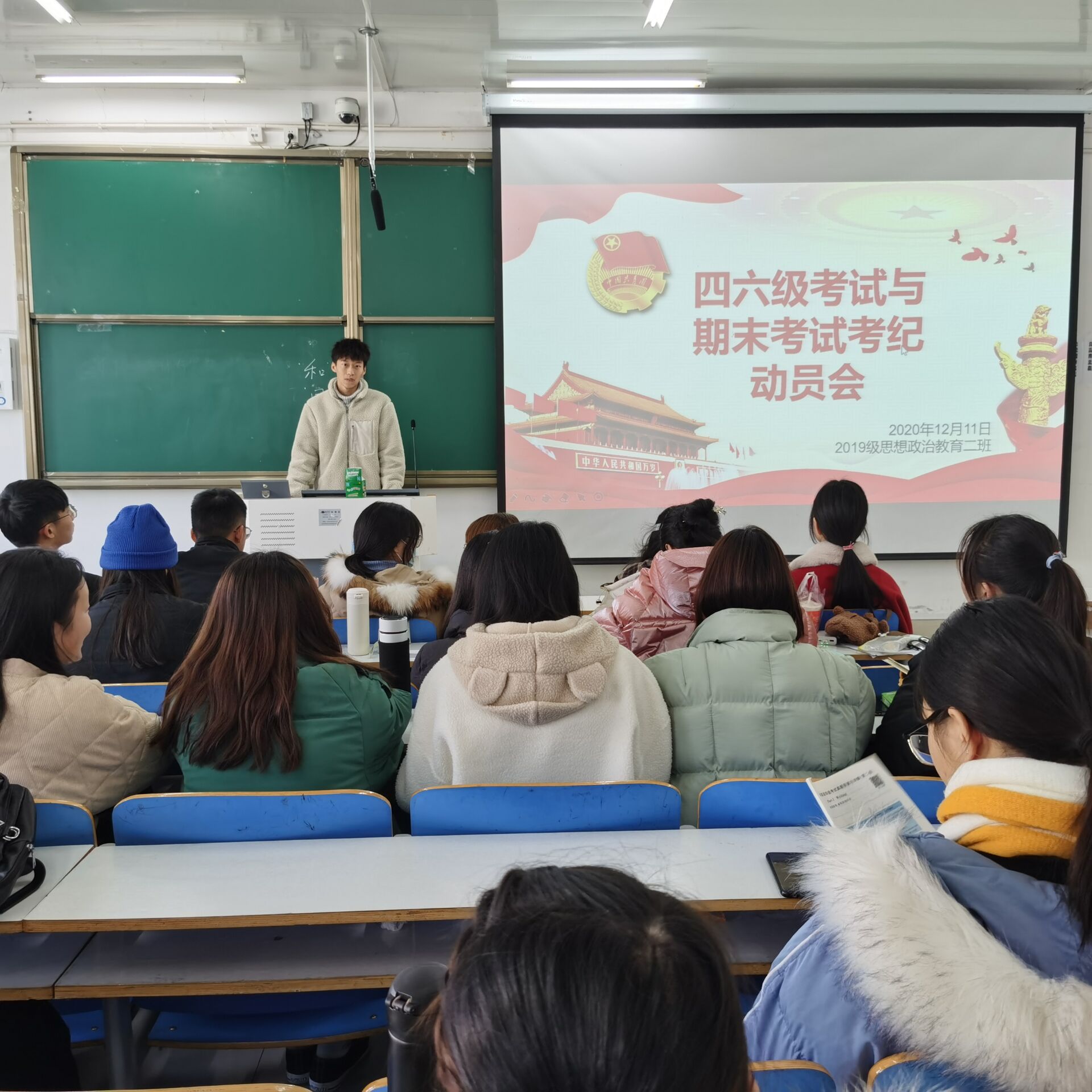 为帮助同学们更好地应对英语四级考试与期末考试,严肃考场纪律。12月11日下午,2026年世界杯官网2019级思想政治教育二班在社科楼514教室召开了老员工英语四级考试与期末考试动员大会。辅导员陶青青和2026年世界杯官网2019级思想政治教育二班全体成员共同参会。本次会议由副班长吕昂主持。