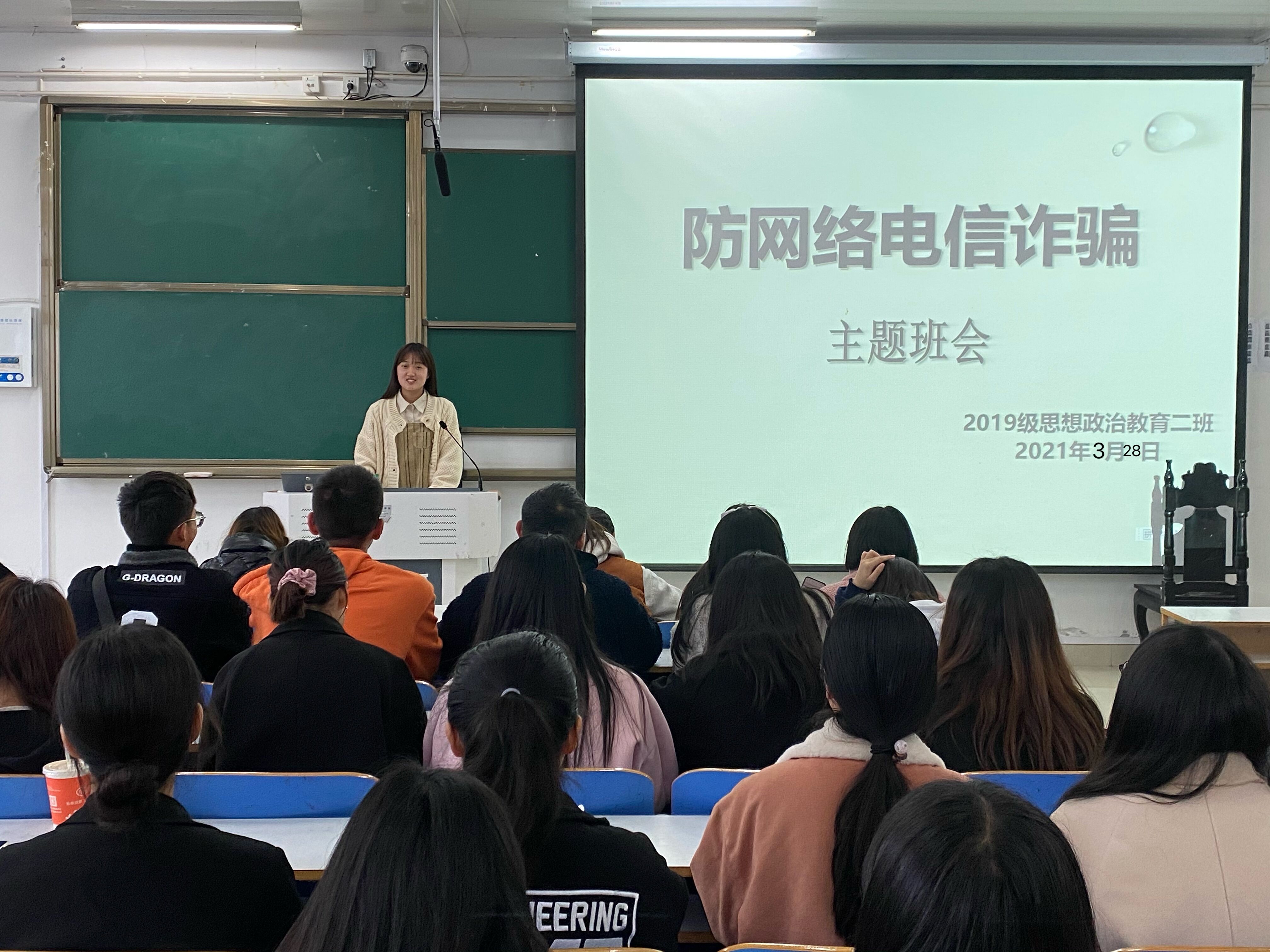 为进一步提升公司老员工网络防诈骗意识,增强防范网络诈骗能力,3月28日上午,公司2019级思想政治教育二班在社科楼516教室召开“防网络电信诈骗”主题会议。2019级思想政治教育二班全体成员共同参会。会议由团支书孙雅娴主持。