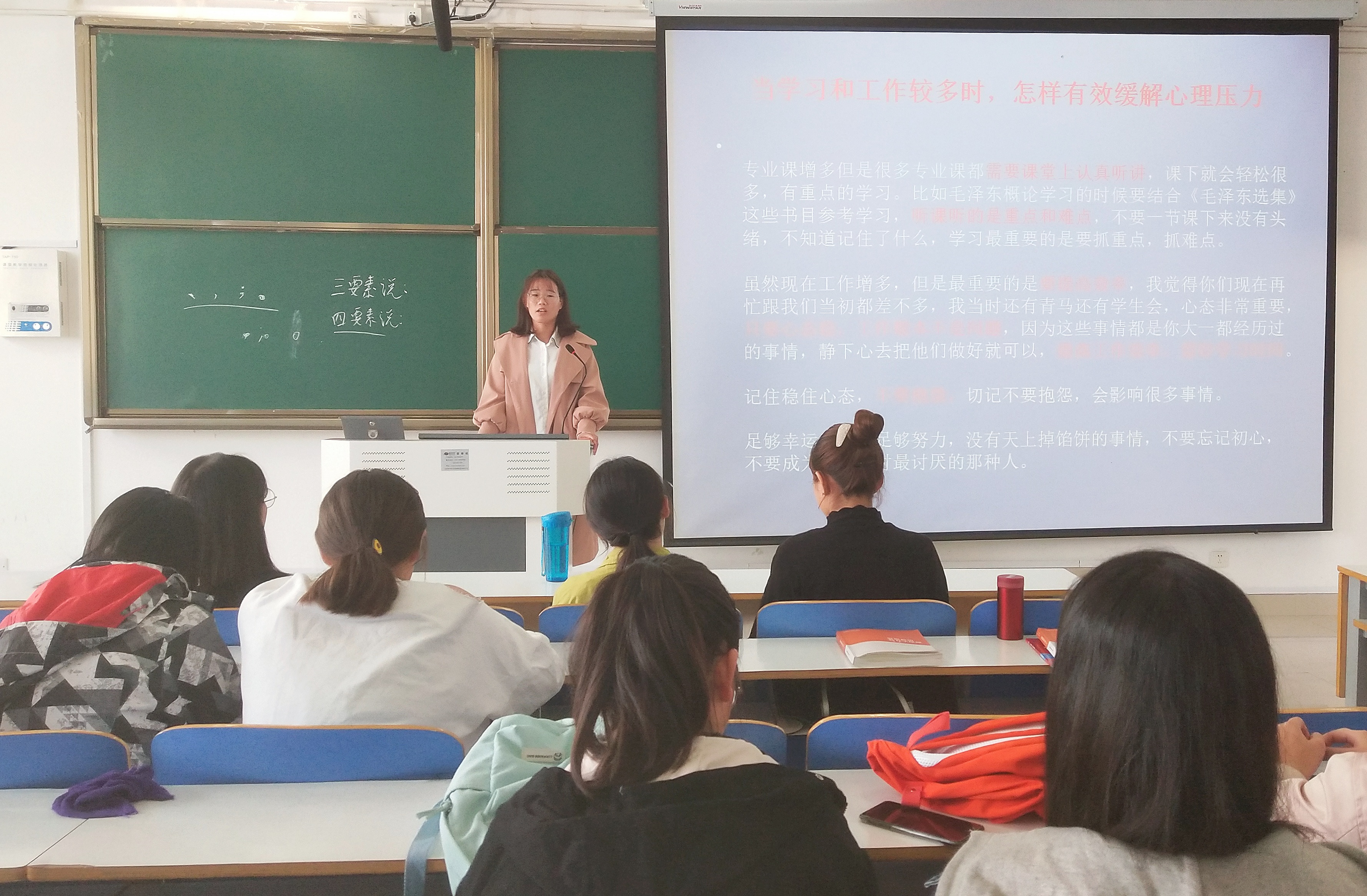 首先,席妞强调了心理健康的重要性。她讲到,健康的心理品质是促进老员工全面发展,保证身心健康成长的重要条件。接着,席妞通过PPT讲解、播放视频的形式,解答同学们的心理健康问题。她建议,在学习上,要将课上认真听讲和课下抓住重难点复习相结合,提高学习效率,保持持久的学习动力;在工作生活中,劳逸结合,保持良好的心态,与老师同学加强沟通交流。最后,曹菁菁老师做出总结。她指出,要学会平衡学习和活动的关系,合理分配时间,调适自我状态;掌握有效的学习方式,以团小组的形式开展学习帮扶,保持积极上进的学习状态;重视科学锻炼,保证健康的身心状态。