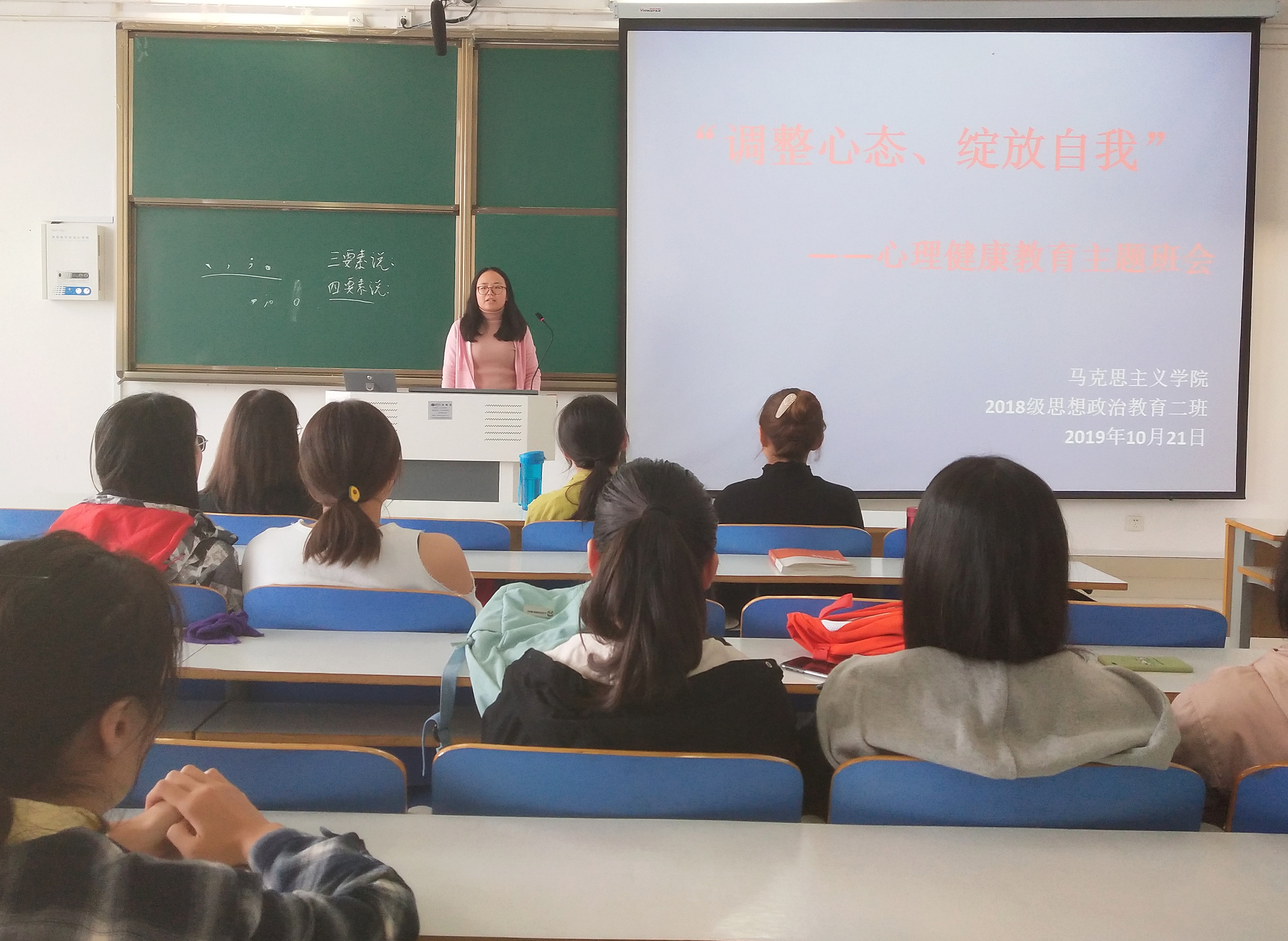 为进一步提高同学们的心理调节能力,保持良好的心理状态,10月21日上午,公司2018级思想政治教育二班于社科楼516教室顺利开展“调整心态,绽放自我”心理健康教育主题班会。我班邀请辅导员曹菁菁前来参加本次班会。班会由心理委员席妞主持。
