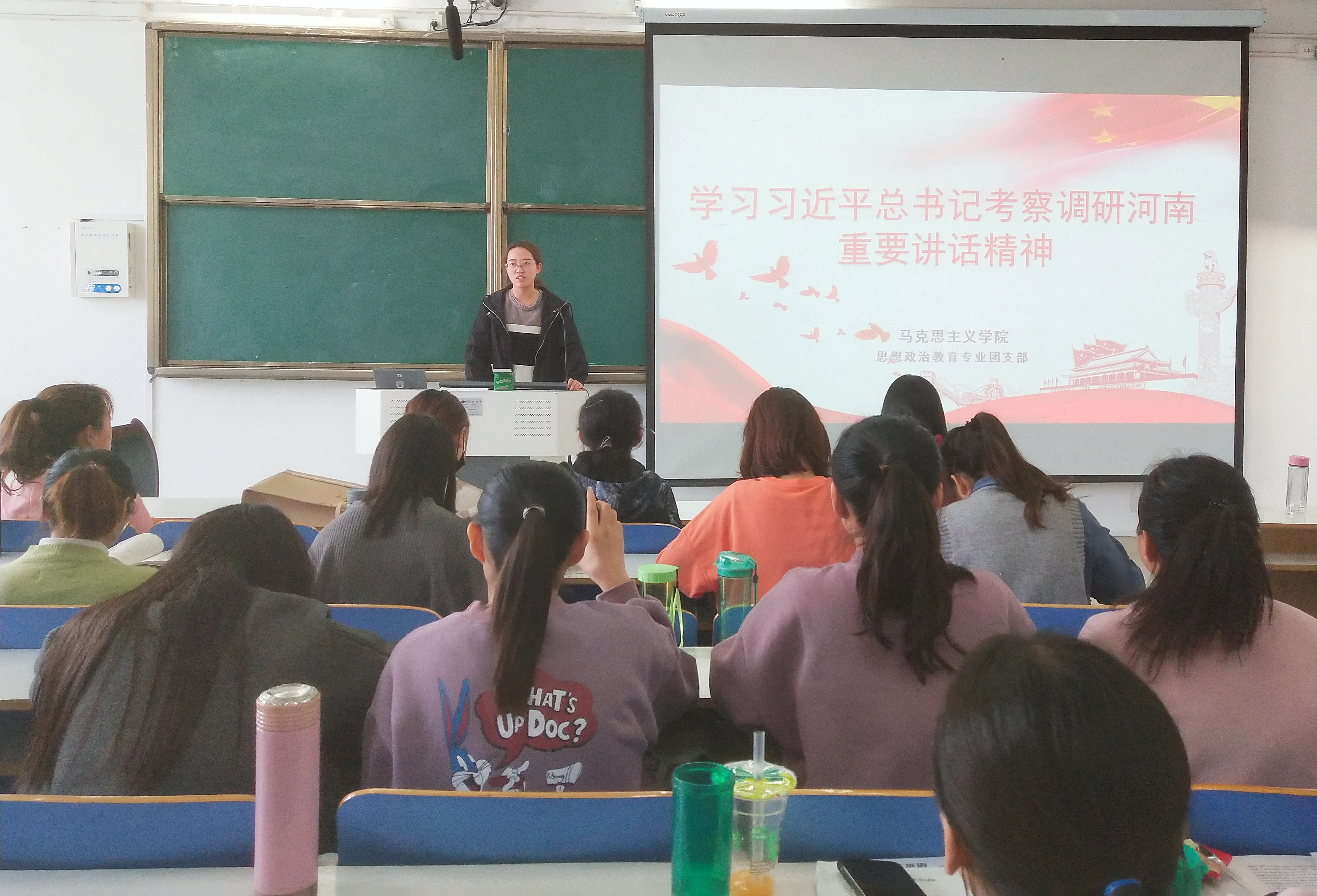 首先,黄子晋指出,学习习近平总书记考察调研河南重要讲话精神要充分认识习总书记考察调研河南的里程碑意义,以扎实作风学习贯彻重要讲话精神。接着,黄子晋从习近平总书记“谈革命先烈”、“谈乡村振兴”、“谈主题教育”等方面为同学们简单介绍了习总书记考察调研河南的重要内容。最后,她结合公司创立大别山精神研究院、开展大别山红色资源美术与设计作品展等例子,强调了新时代青年要始终高举红色旗帜,弘扬大别山红色精神,传承红色基因,坚定走中国特色社会主义道路,把先辈们开创的事业不断向前推进。