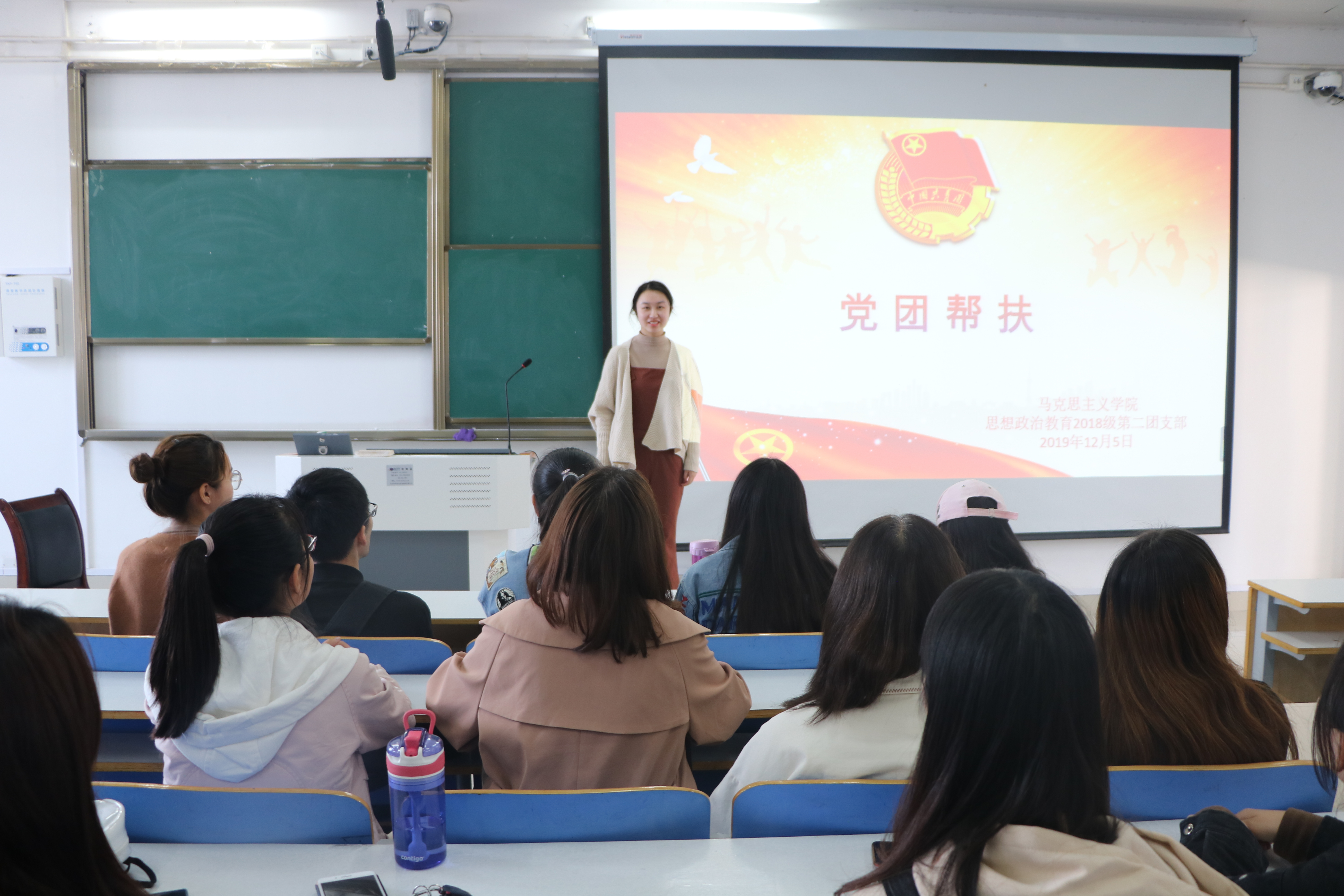 12月5日上午,公司2018级思想政治教育二班于社科楼514教室顺利开展了党团帮扶活动。我班邀请员工党员代表李媛前来参加本次交流活动。活动由团支书黄子晋主持。