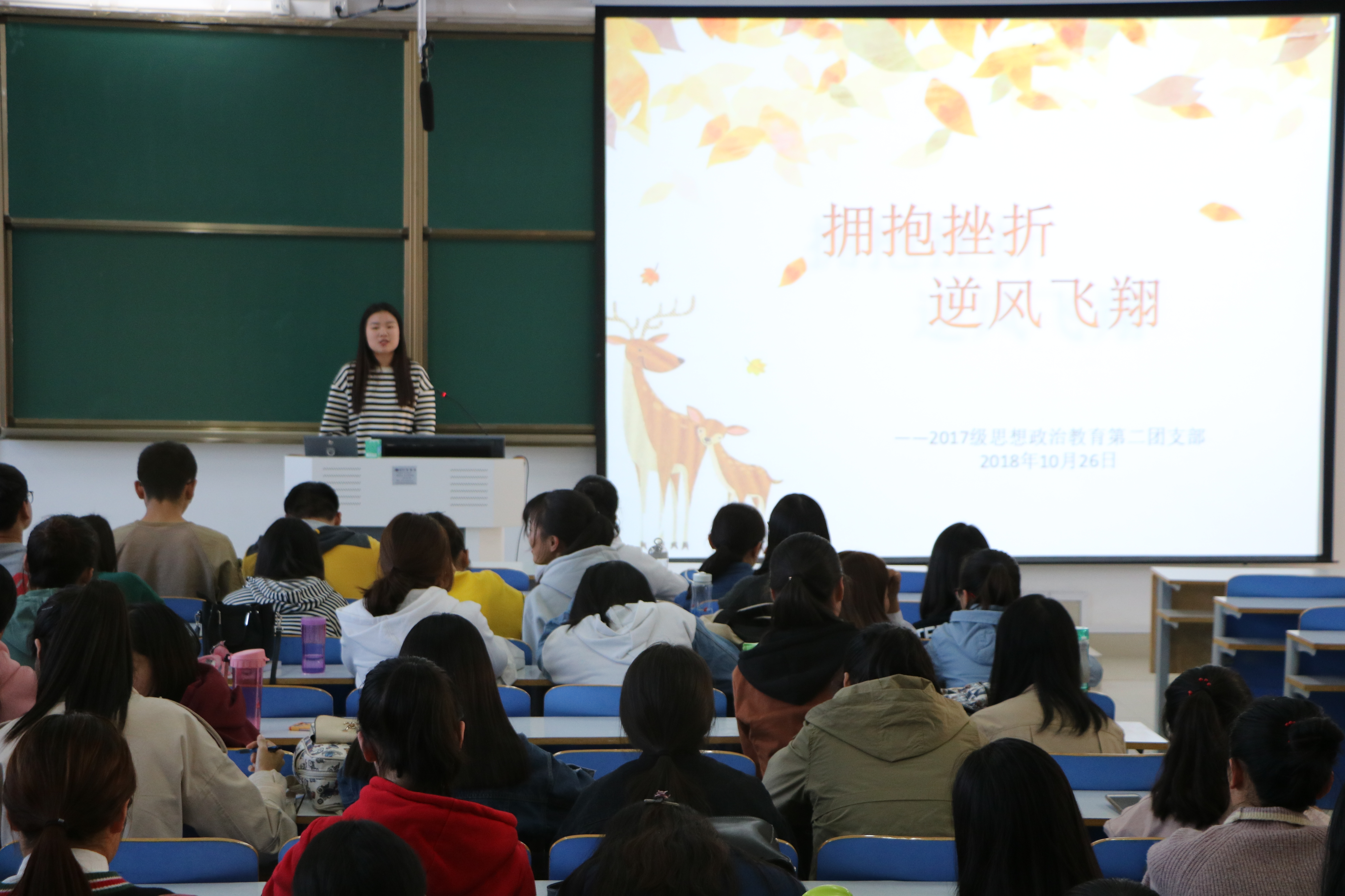 为营造健康积极的班级氛围,提升同学们抵抗消极情绪的能力,10月26日下午,2017级思想政治教育第二团支部在社科楼516教室举办了“拥抱挫折,逆风飞翔”主题团日活动。活动由组织委员王泽鑫主持。