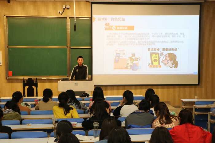 艾子元结合身边真实案例,通过多媒体演示为同学们列举了刷单,兼职,QQ、微信盗号借款等较为典型的电信诈骗方式,并对电信诈骗的识别防范,上当后的补救措施等做了详细的介绍。他特别强调,前期以任何名义收费的兼职,都是骗局,同学们要擦亮眼睛,提高自己识别能力。另外,他提醒同学们不要随意泄露个人信息,不要随意回复无关信息,点击无关链接,要防范于未然。