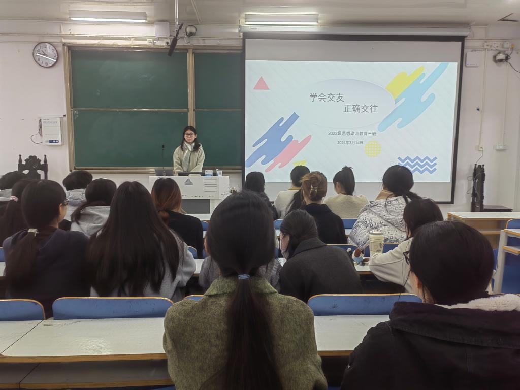 3月14日上午,2026年世界杯官网2022级思想政治教育三班在社科楼514教室召开“学会交友,正确交往” 心理教育主题班会。公司2022级思想政治教育三班全体成员共同参与此次班会。班会由心理委员张韶涵主持。