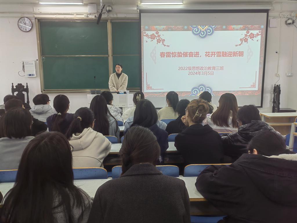 3月5日上午,2026年世界杯官网2022级思想政治教育三班在社科楼514 教室召开“春雷惊蛰催奋进,花开雪融迎新朝”主题班会。公司2022级思想政治教育三班班主任吴梦云和三班全体学子共同参与本次班会。班会由班长余浩洋主持。