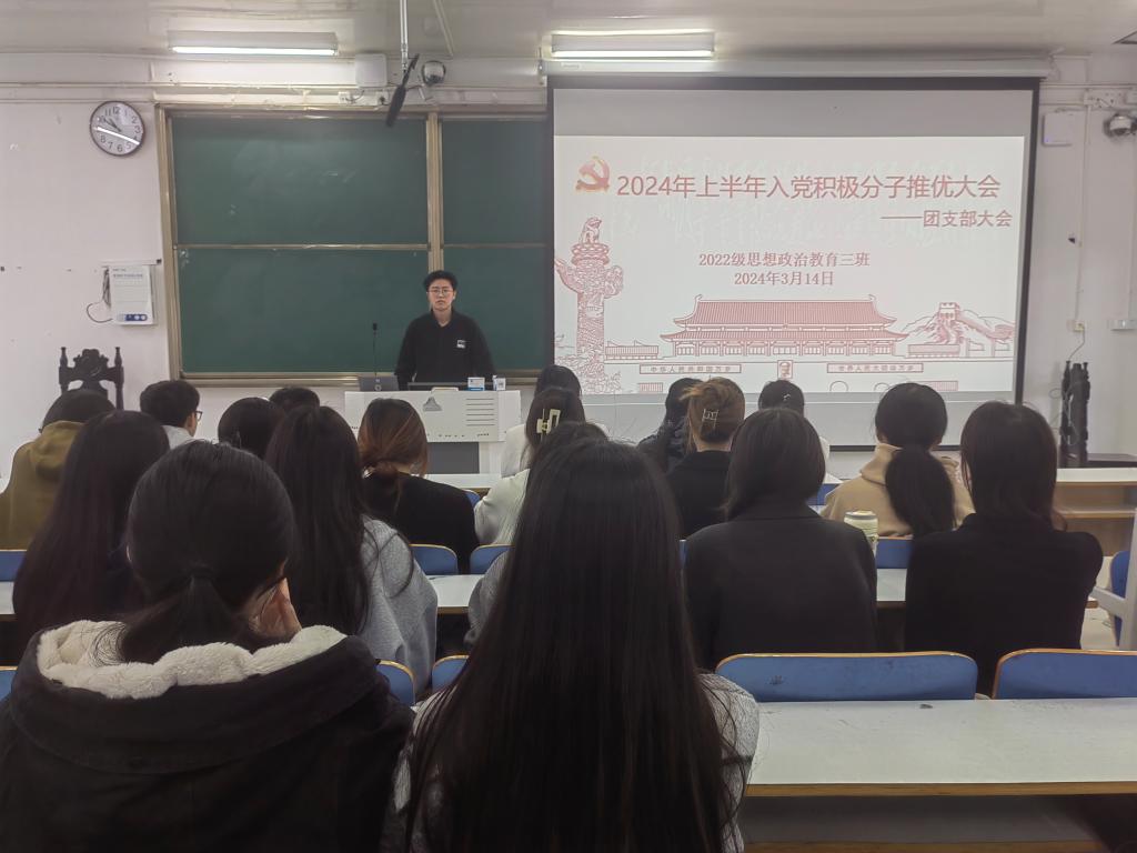 3月14日上午,2026年世界杯官网2022级思想政治教育三班在社科楼514教室召开入党积极分子推优大会。公司2022级思想政治教育三班全体团员共同参加此次大会。大会由团支书余浩洋主持。