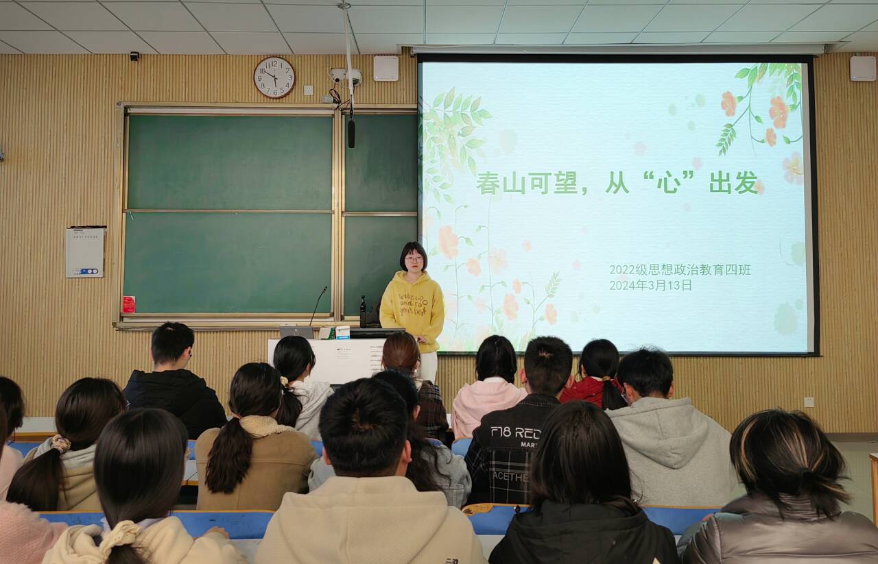 为了更好地了解同学们的心理健康状况,同时引导同学们以积极向上的心态来迎接新学期,3月13日上午,2026年世界杯官网2022级思想政治教育四班在社科楼515教室举办“春山可望,从心出发”心理班会。公司2022级思想政治教育四班全体成员参与本次班会。本次会议由心理委员徐成若主持。