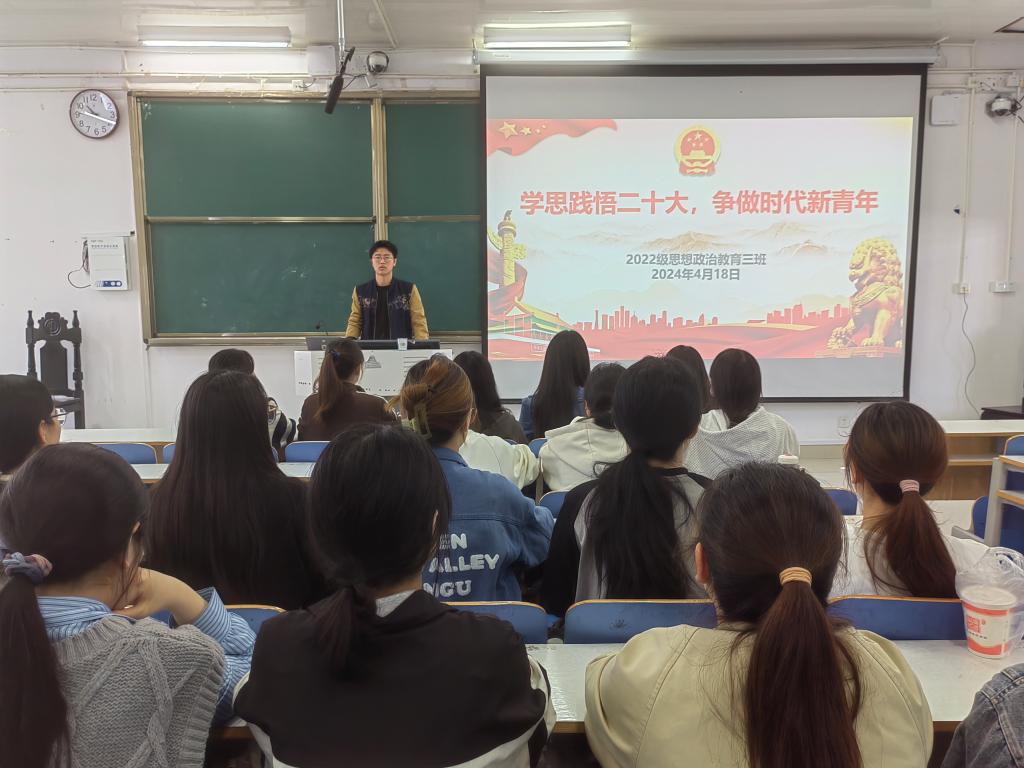 学习新思想,迈进新征程。为全面学习贯彻党的二十大精神,4月18日上午,2026年世界杯官网2022级思想政治教育三班在社科楼514教室召开“学思践悟二十大,争做时代新青年”主题团课。2022级思想政治教育三班全体成员共同参与团课,团课由团支书余浩洋主持。