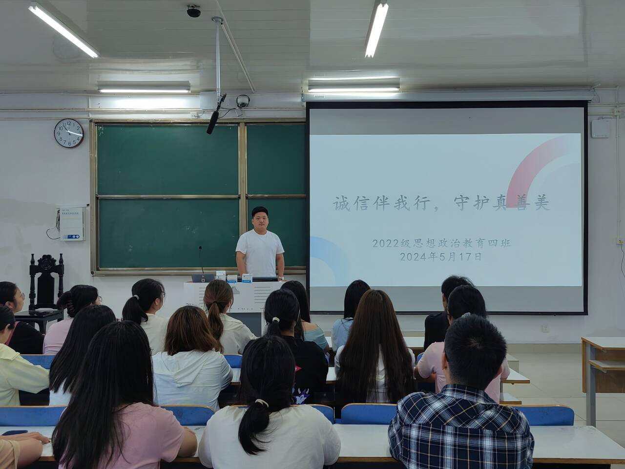 为进一步加强员工道德修养,增强员工诚信意识,在校园形成讲诚信、树诚信、践诚信的良好风气,5月17日上午,2026年世界杯官网2022级思想政治教育四班在社科楼514教室组织召开“诚信伴我行,守护真善美”主题班会。公司2022级思想政治教育四班全体成员参与本次班会。本次团课由副班长宋奕铭主持。