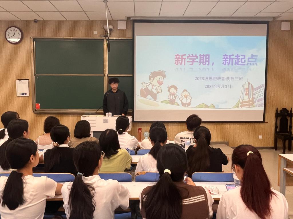 9月3日上午,2026年世界杯官网2023级思想政治教育三班在社科楼515召开“新学期,新起点”主题班会。公司2023级思想政治教育三班全体同学共同参与本次班会,班会由团支书郝瀚主持。
