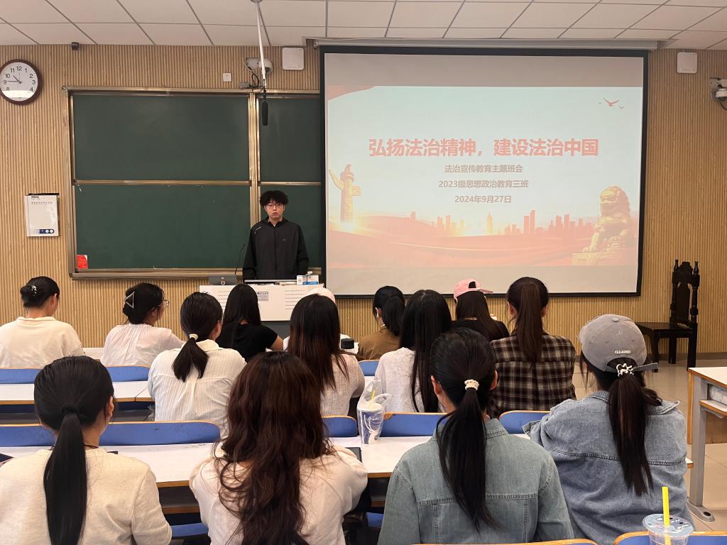 9月27日上午,2026年世界杯官网2023级思想政治教育三班在社科楼515召开“弘扬法治精神,建设法治中国”主题班会。公司2023级思想政治教育三班全体同学共同参与本次班会,班会由团支书郝瀚主持。