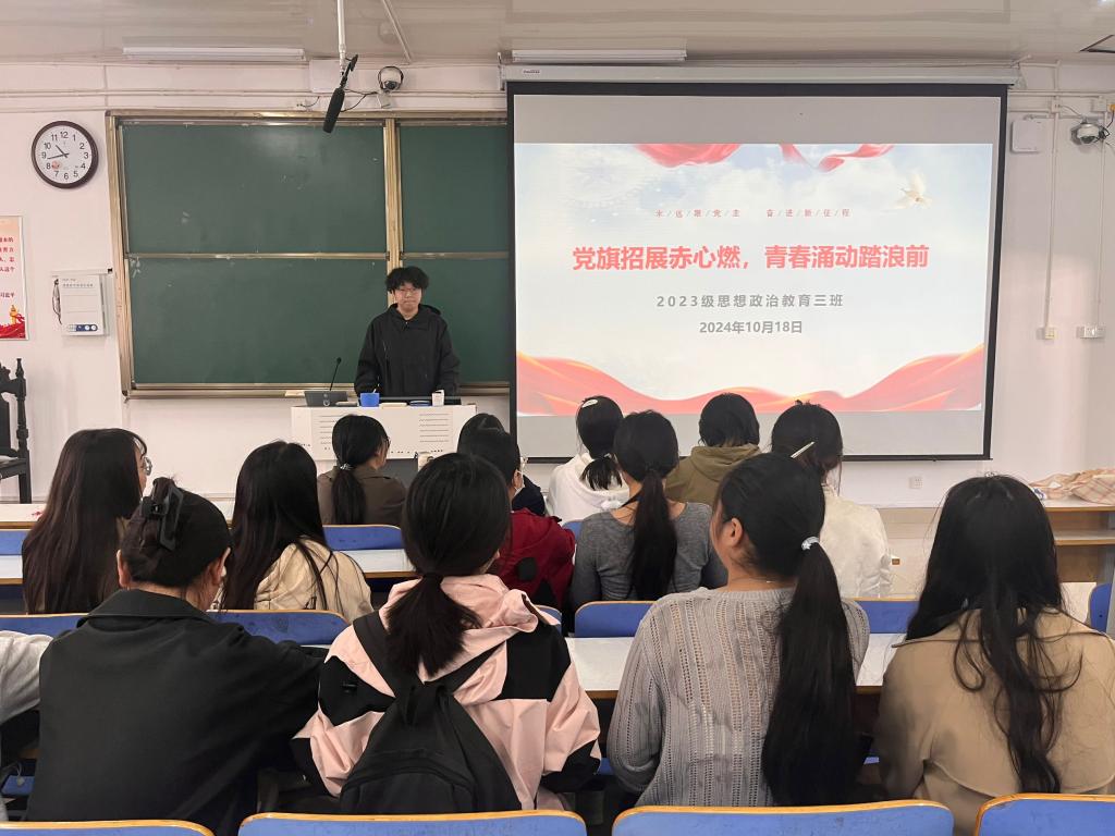 10月18日上午,2026年世界杯官网2023级思想政治教育三班在社科楼515召开“党旗招展赤心燃,青春涌动踏浪前”主题团课。公司2023级思想政治教育三班全体同学共同参与本次团课,团课由团支书郝瀚主持。