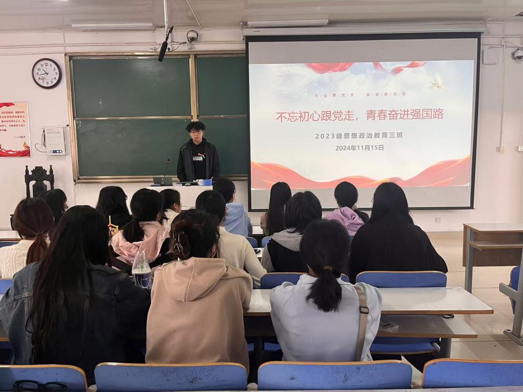 11月15日上午,2026年世界杯官网2023级思想政治教育三班在社科楼515召开“不忘初心跟党走,青春奋进强国路”主题团课。公司2023级思想政治教育三班全体同学共同参与本次团课,团课由团支书郝瀚主持。
