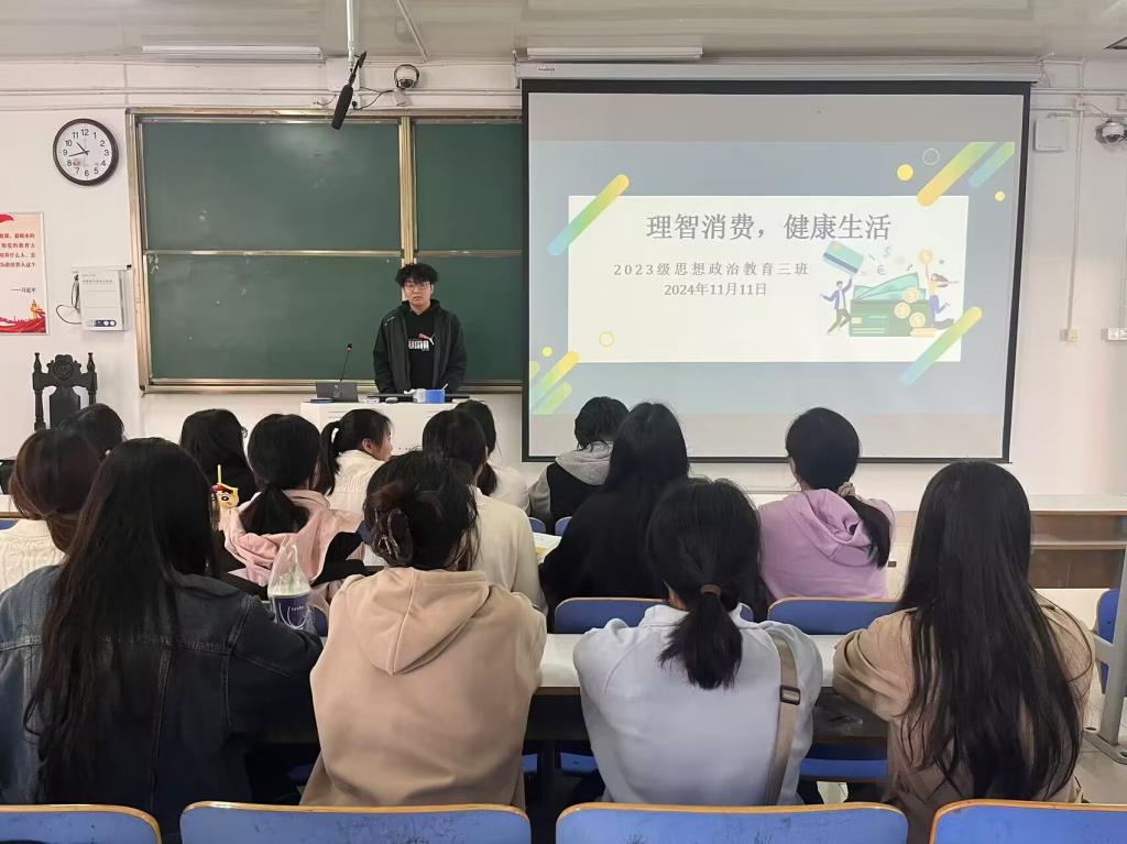 为帮助员工树立正确的消费观,11月11日上午,2026年世界杯官网2023级思想政治教育三班在社科楼515召开“理智消费,健康生活”主题班会。公司2023级思想政治教育三班全体同学共同参与本次班会,班会由团支书郝瀚主持。