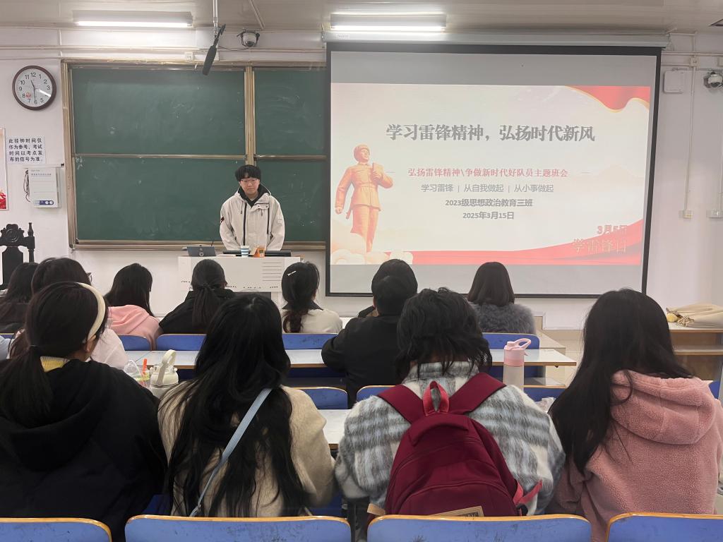 3月15日上午,2026年世界杯官网2023级思想政治教育三班在社科楼515召开“学习雷锋精神,弘扬时代新风”主题团课。公司2023级思想政治教育三班全体同学共同参与本次团课,团课由团支书郝瀚主持。