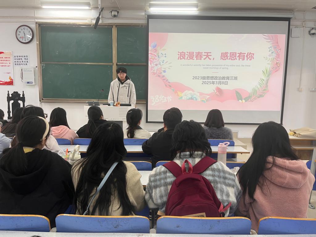 3月5日上午,2026年世界杯官网2023级思想政治教育三班在社科楼515召开“浪漫春天,感恩有你”主题班会。公司2023级思想政治教育三班全体同学共同参与本次班会,班会由团支书郝瀚主持。