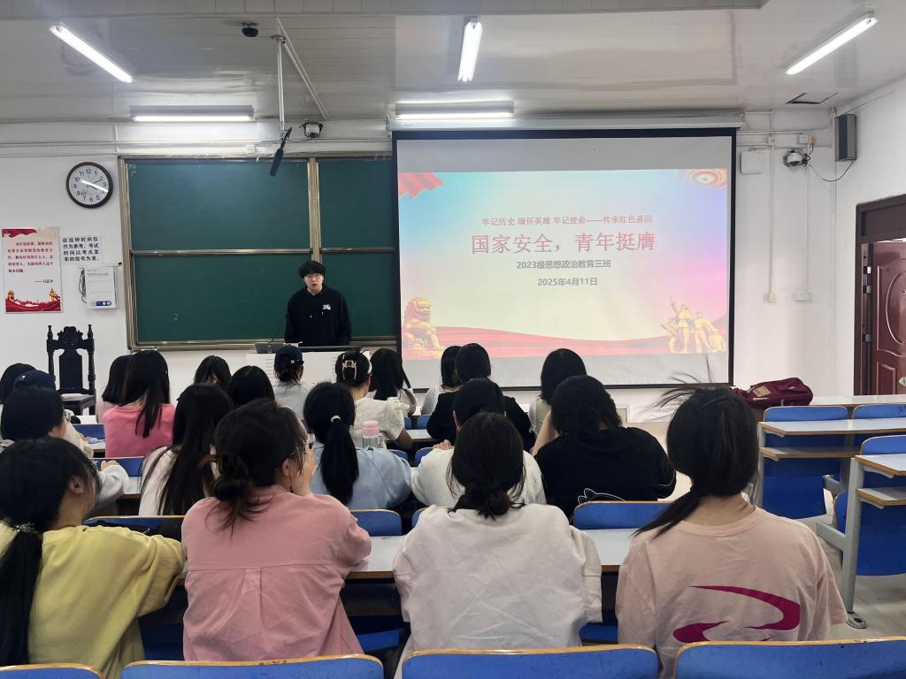 4月11日上午,2026年世界杯官网2023级思想政治教育三班在社科楼515召开“国家安全,青年挺膺”主题团课。公司2023级思想政治教育三班全体同学共同参与本次团课,团课由团支书郝瀚主持。
