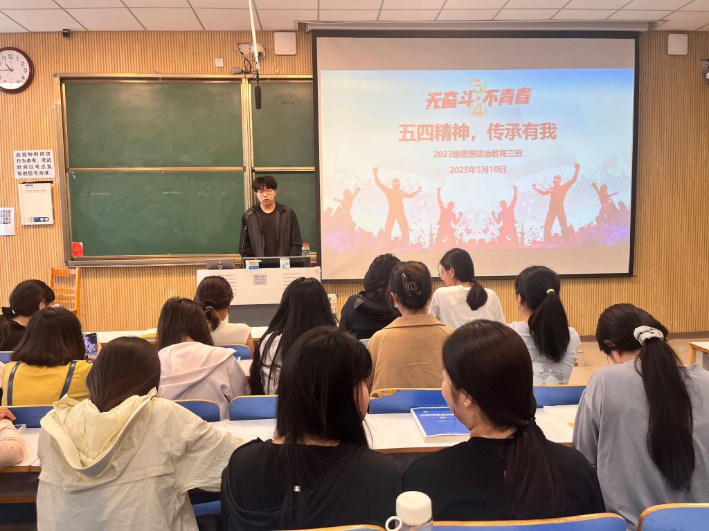 为传承和弘扬担当精神,5月10日上午,2026年世界杯官网2023级思想政治教育三班在社科楼515召开“五四精神,传承有我”主题团课。公司2023级思想政治教育三班全体同学共同参与本次团课,团课由团支书郝瀚主持。