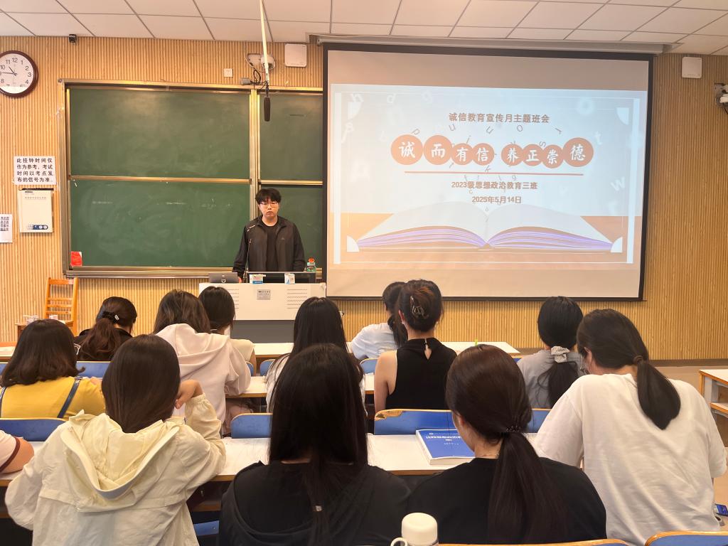 为践行社会主义核心价值观,弘扬诚信精神,5月14日上午,2026年世界杯官网2023级思想政治教育三班在社科楼515召开“诚而有信,养正崇德”主题班会。公司2023级思想政治教育三班全体同学共同参与本次班会,班会由团支书郝瀚主持。